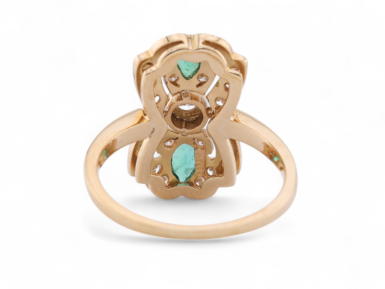 Vintage shield cluster ring set with emerald and diamonds in 18kt yellow gold