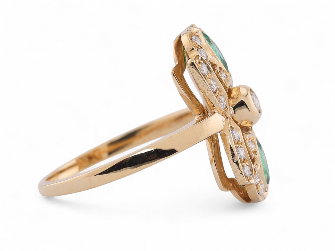 A vintage cluster ring of bow motif design set with two marquise-shaped emeralds estimated to weigh 0.20 carats in total and a central brilliant-cut diamond framed by further small diamonds estimated to weigh 0.29 carats in total. Mounted in 18kt yellow gold, Italian marked.
