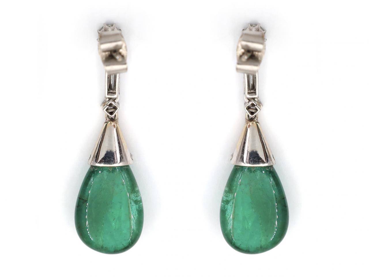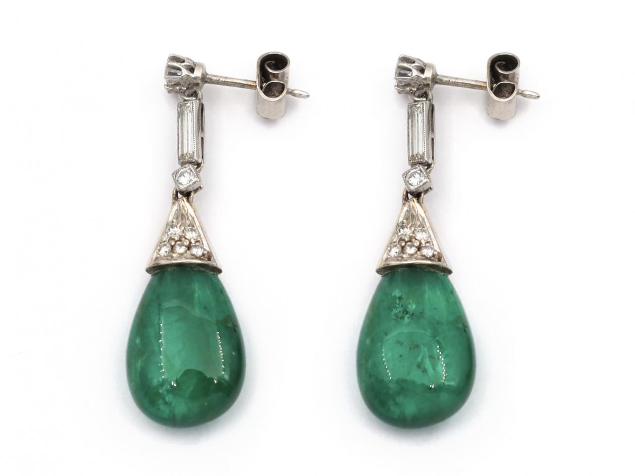 Vintage emerald cabochon and diamond drop earrings in platinum. A matching pair of earrings, each consisting of an estimated 5.80ct pear cabochon emerald in a diamond set surmount settings, suspended from an articulated linear drop of round and baguette cut diamonds in claw and rubover settings and secured with a post and butterfly fitting. Estimated total emerald weight 11.60cts. Estimated total diamond weight 1.00cts.