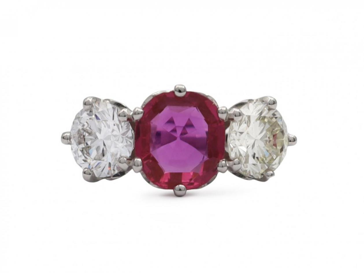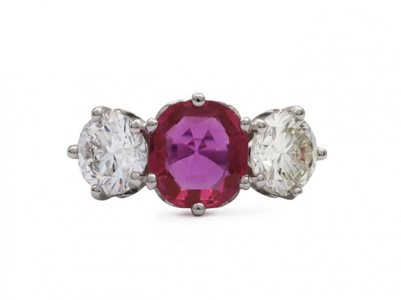 Vintage fancy pink sapphire and diamond three stone engagement ring in platinum. Set with a 1.34ct cushion shape mixed cut fancy pink Burmese sapphire in a claw setting, flanked to either side with two round Old European cut diamonds in claw settings, to a graduating three stone design with curving claws and pierced open gallery, the inwardly tapering shoulders curve to a slim shank. Estimated total diamond weight 1.80cts. Marked platinum.