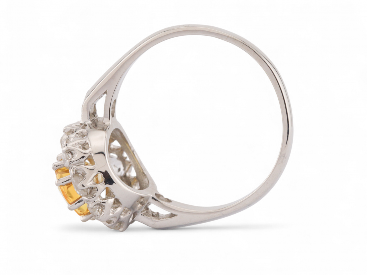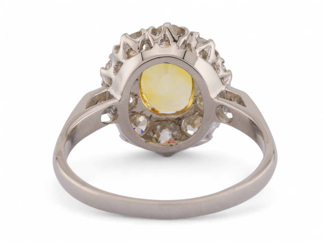 Vintage fancy yellow sapphire and diamond oval cluster ring in platinum. Centrally set with an estimated 1.50ct oval mixed cut fancy yellow sapphire in a claw setting, encircled by a row of ten old mine cut diamonds in claw settings, to a coronet cluster design with curving claws, pierced open gallery and met to either side with diamond set shoulders which smooth to solid shank. Marked platinum.