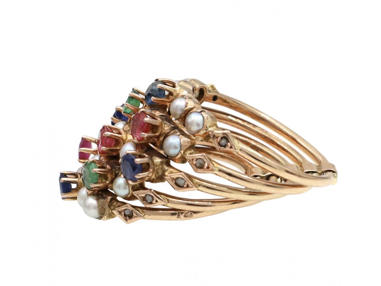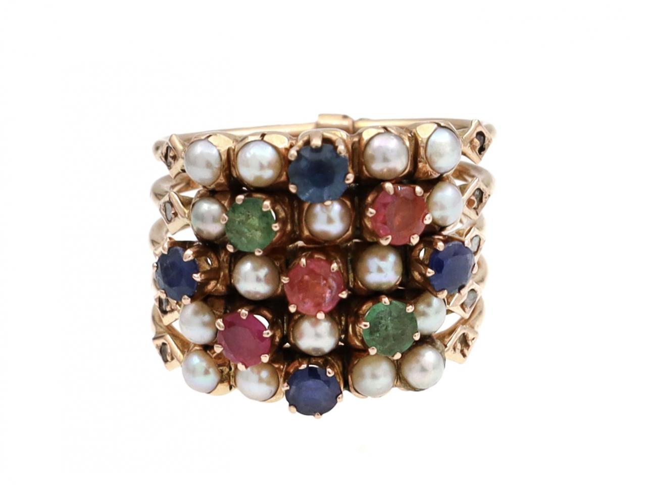 Vintage five strand ring set with pearls, emeralds, sapphires and rubies.