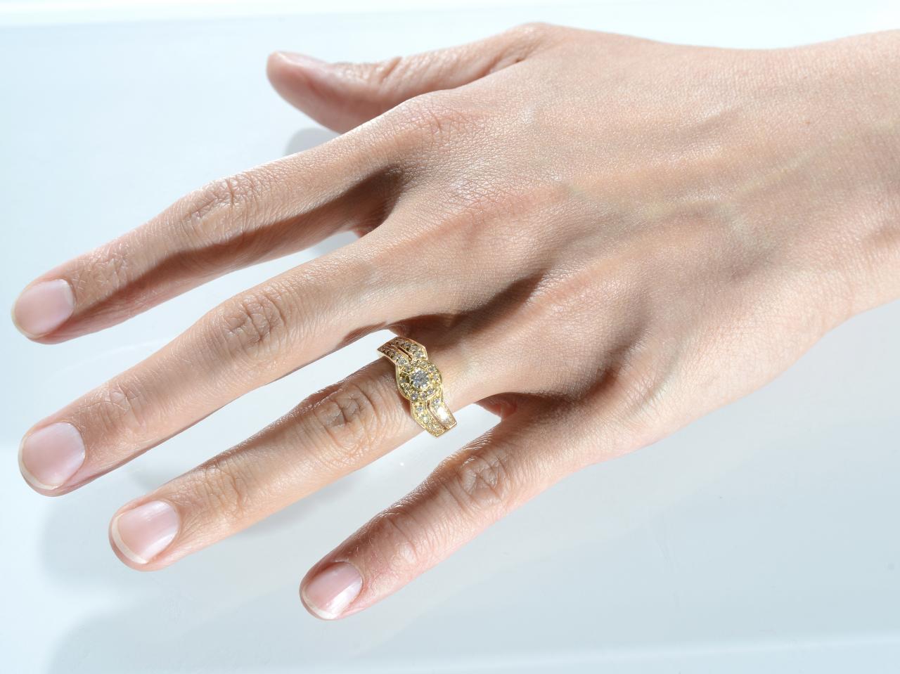 Vintage French 18kt yellow gold diamond cluster ring, centrally set with a round brilliant cut diamond in a raised claw setting, surrounded by an undulating cluster which flow to broad double row shoulders which continue to a solid shank. Estimated total diamond weight 0.70cts.