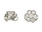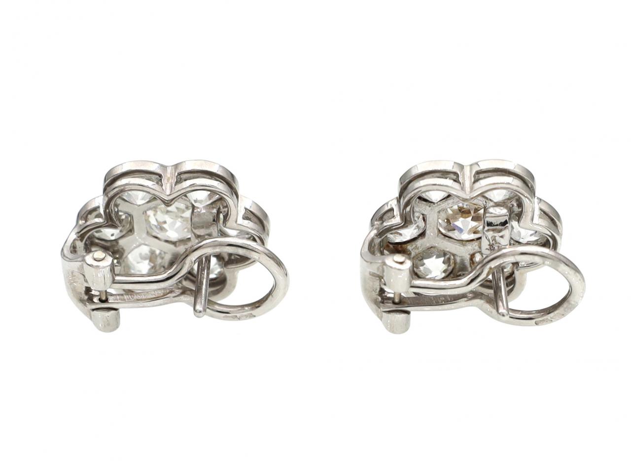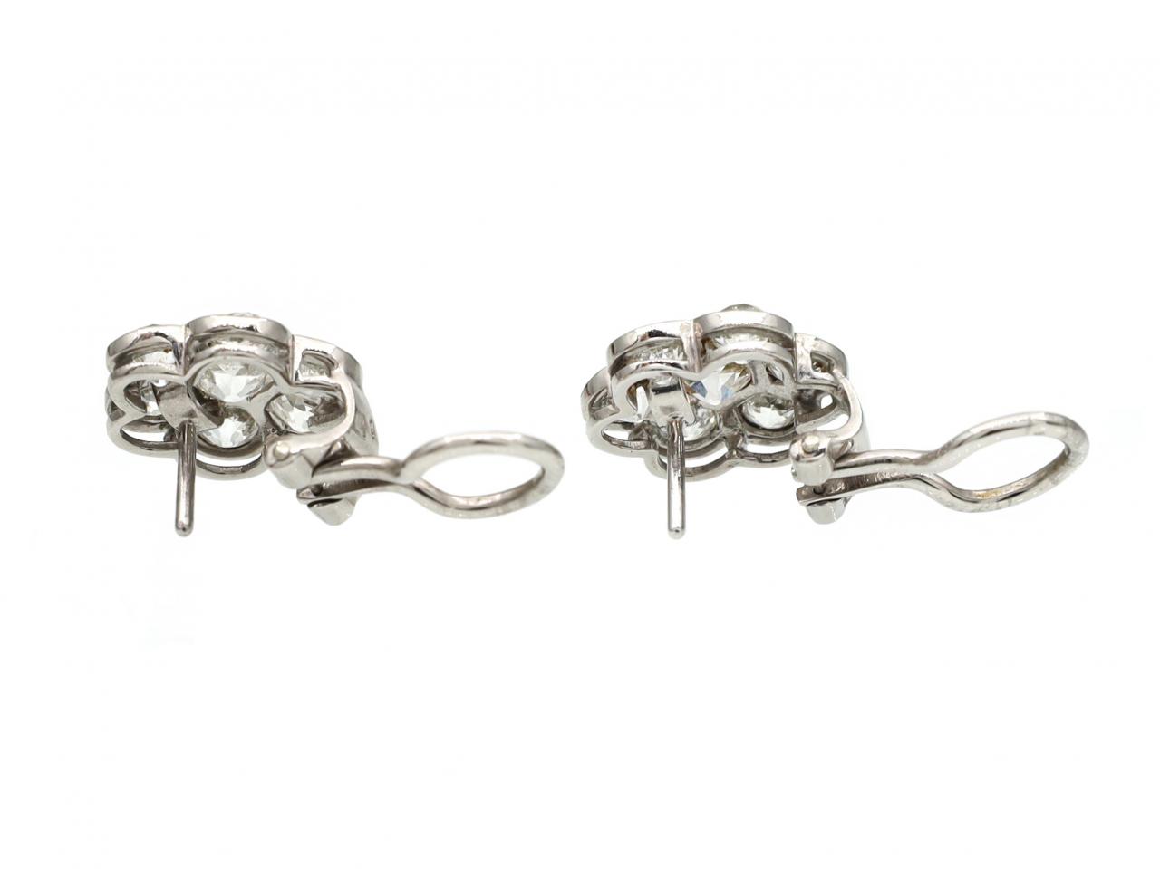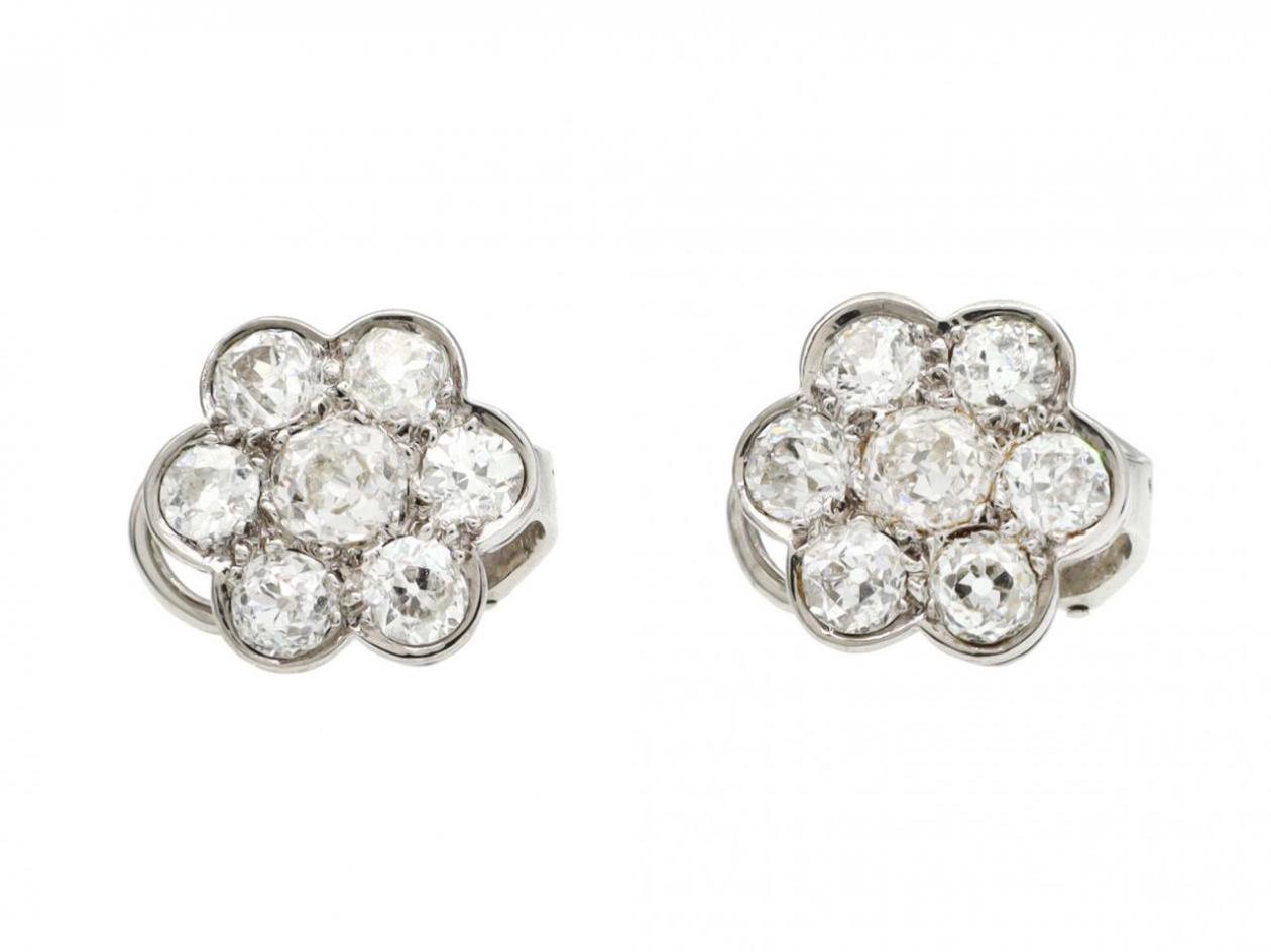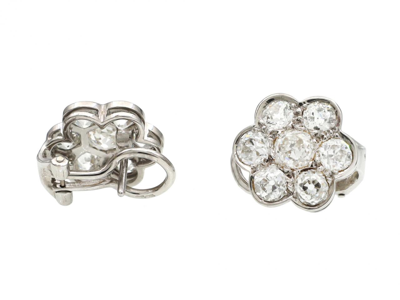 Vintage French diamond floral cluster earrings in 18kt white gold. A matching pair of earrings, each centrally set with a round Old European cut diamond in a grain setting, surrounded by six round Old European cut diamonds in grain settings, to an impressive flower cluster with scalloped polished edges and open linear gallery, fitted to the reverse with a secure post and hinged omega clip. Estimated total diamond weight 3.00cts. Hallmarked 18kt gold, French.