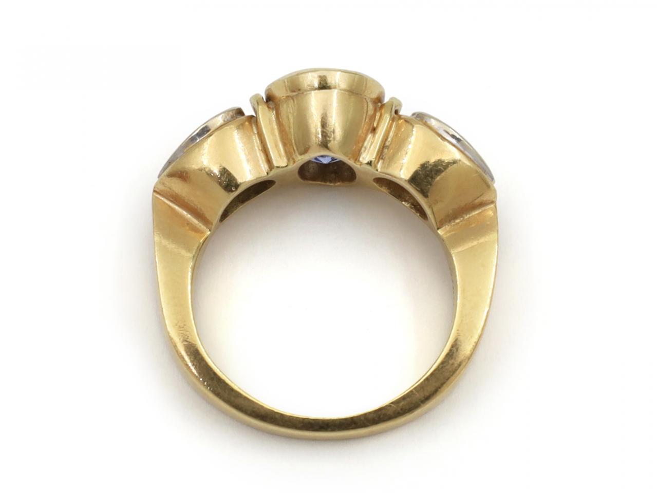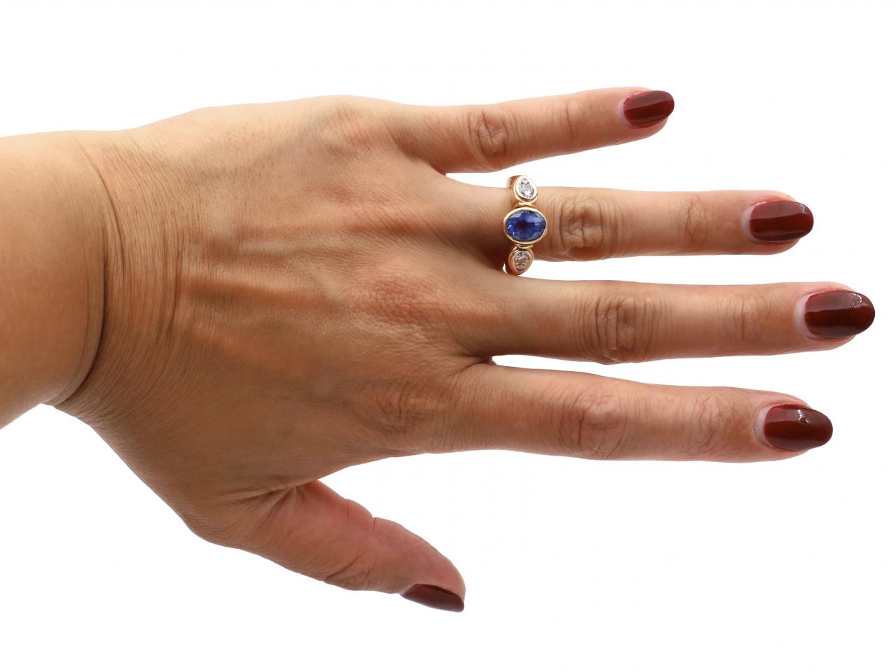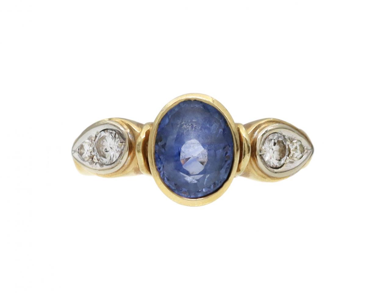 Vintage Giansanti Ceylon sapphire and diamond three stone ring in 18kt yellow gold. Centred with an estimated 2.50ct oval mixed cut Ceylon sapphire with no indications of heat treatment, in a solid rubover setting, flanked to either side with four graduating round brilliant cut diamonds in grain settings, to a three stone design with polished frames, gallery and shoulders with inward tapering details before smoothing to a solid chunky shank. Marked 18kt gold, Italian. Signed 'GIANSANTI'.