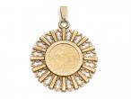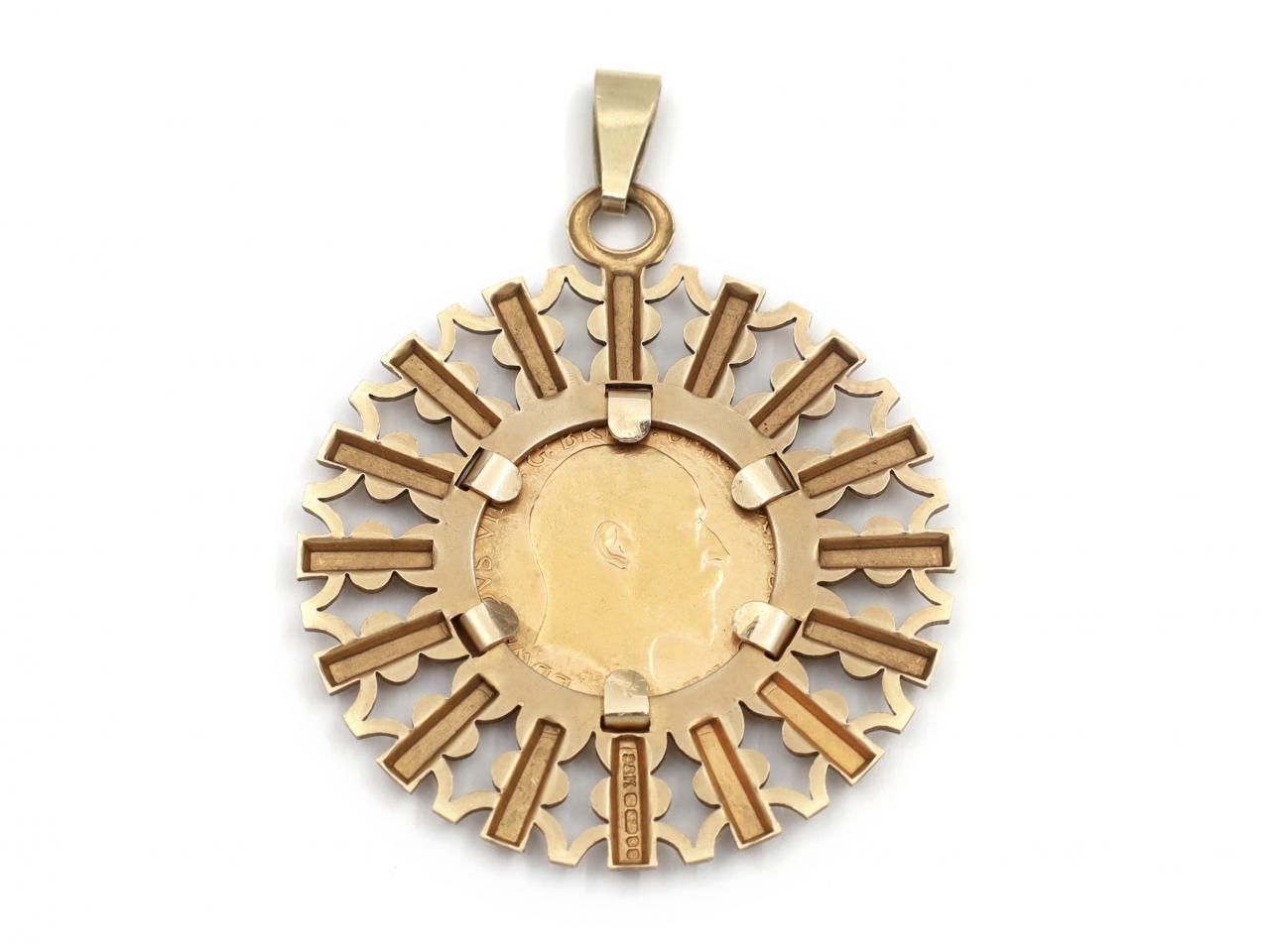Vintage half sovereign coin in a sun burst pendant. A 1907 half sovereign coin, fitted to the centre of a radiating sunburst border with openwork details and fitted to top with a tapering bale.