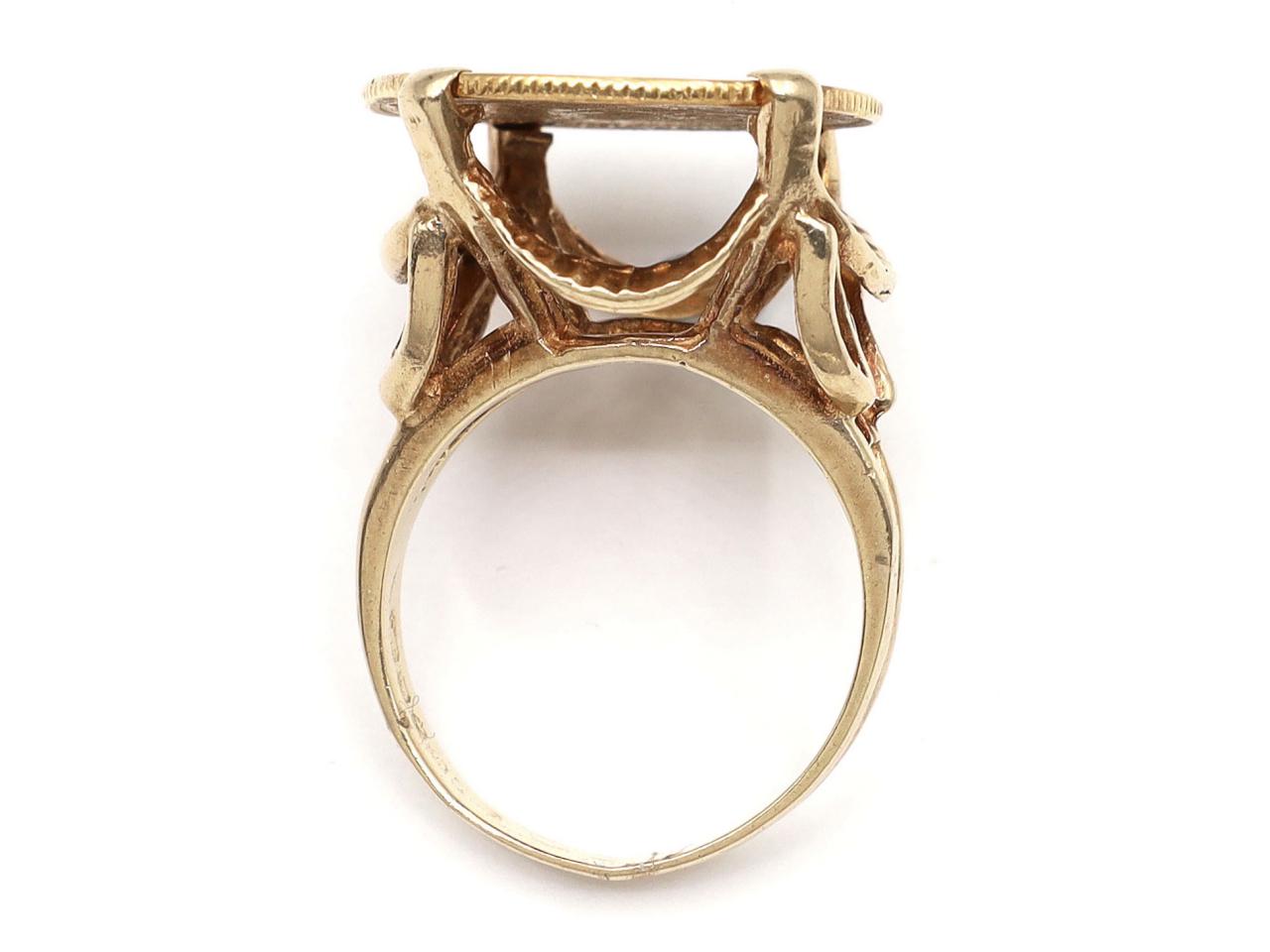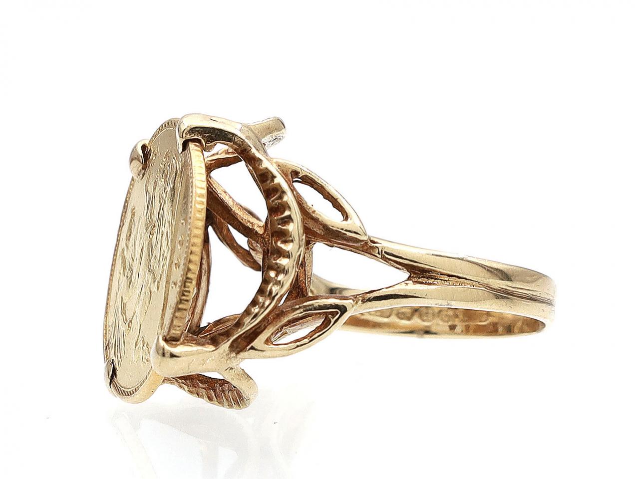 Vintage half sovereign ring in a high elaborate 9kt gold setting.