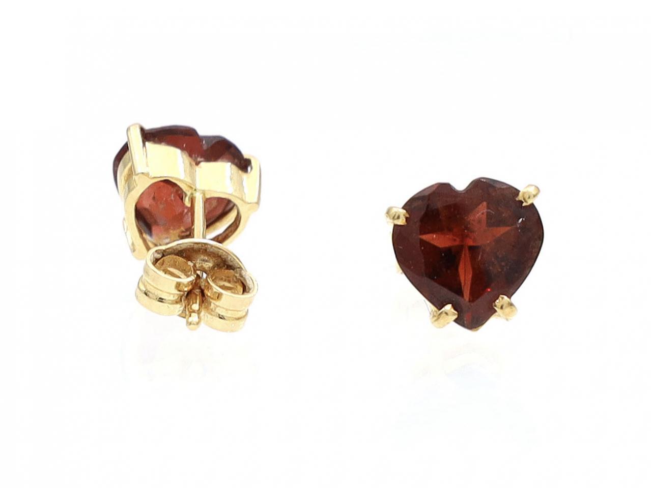 Vintage heart shape garnet stud earrings in yellow gold. A matching pair of stud earrings, each set with a heart shape mixed cut garnet in a claw setting, fitted to the reverse with a secure post and butterfly.