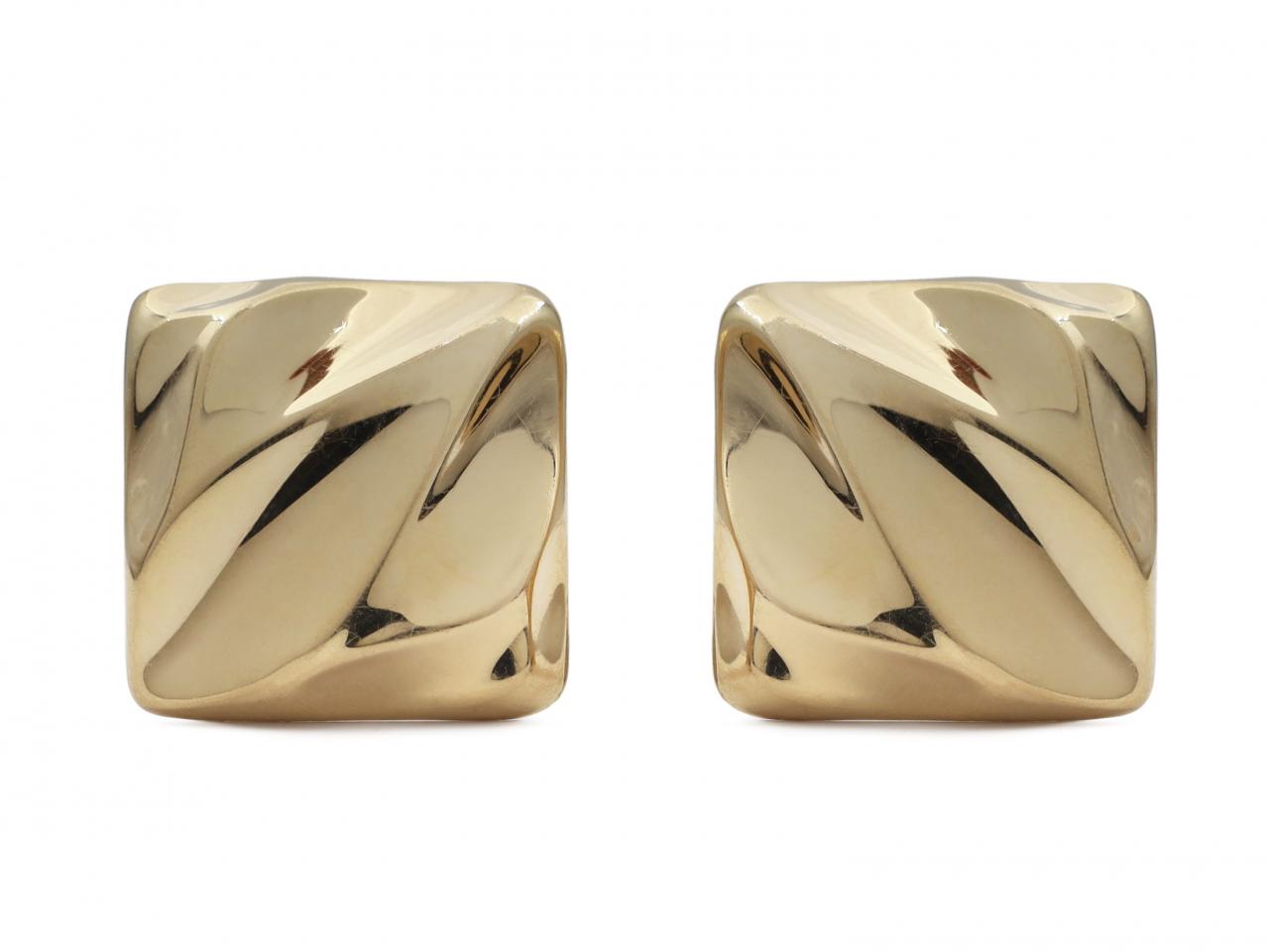 Vintage hollow square ripple earrings in 14kt yellow gold. A matching pair of earrings, consisting of a large hollow square featuring a three-dimensional rippled effect to the top, polished squared edge to the reverse and fitted with a secure post and hinged omega backing. Marked 14kt gold, American.
