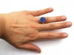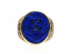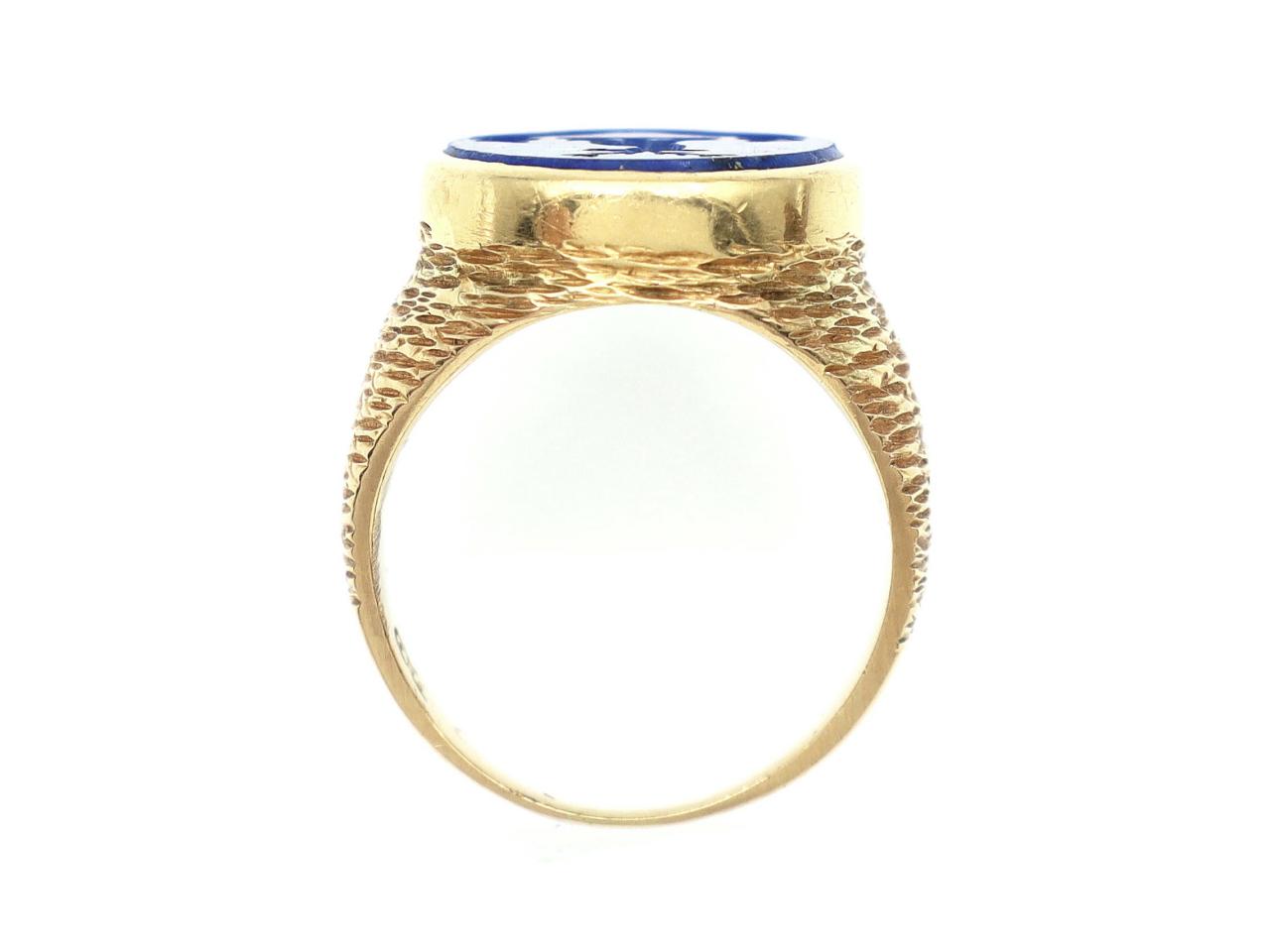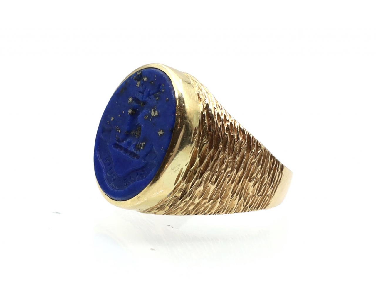 Vintage 'If I can' lapis lazuli intaglio signet ring in 18kt yellow gold. A bright oval lapis lazuli tablet, centred with an engraved intaglio of an elk with a scrolling banner etched in French ' SI JE PUIS' translated as 'IF I CAN', in a rubover setting, surrounded by a polished collet and flanked by integrated broad shoulders with deep textured patterns which taper to a polished shank. Hallmarked 18kt gold.