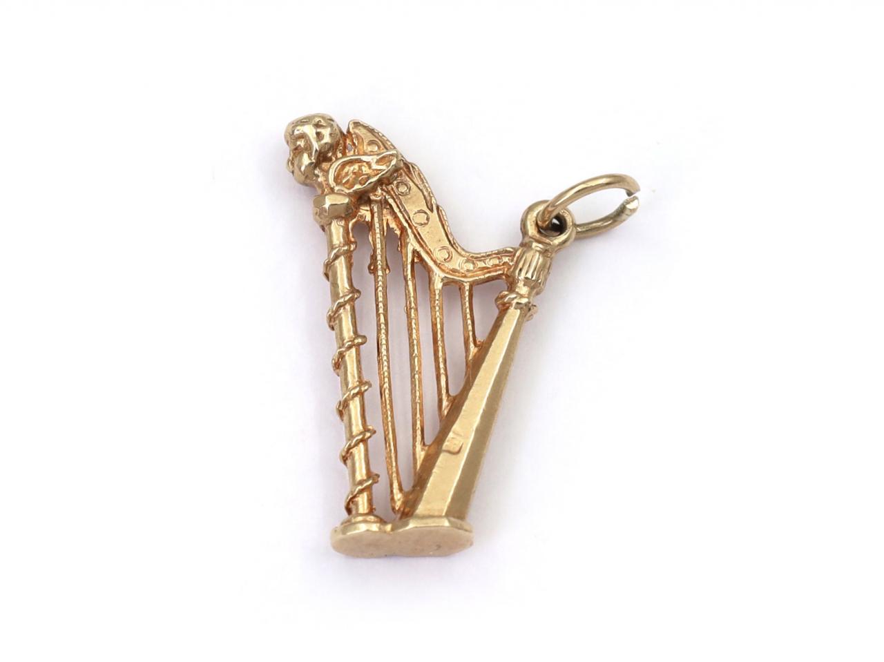 Vintage Irish harp pendant in 9kt yellow gold. An intricately detailed openwork harp featuring the head and wings of a putti and suspended from a circular bale. Hallmarked 9kt gold, Dublin.
