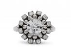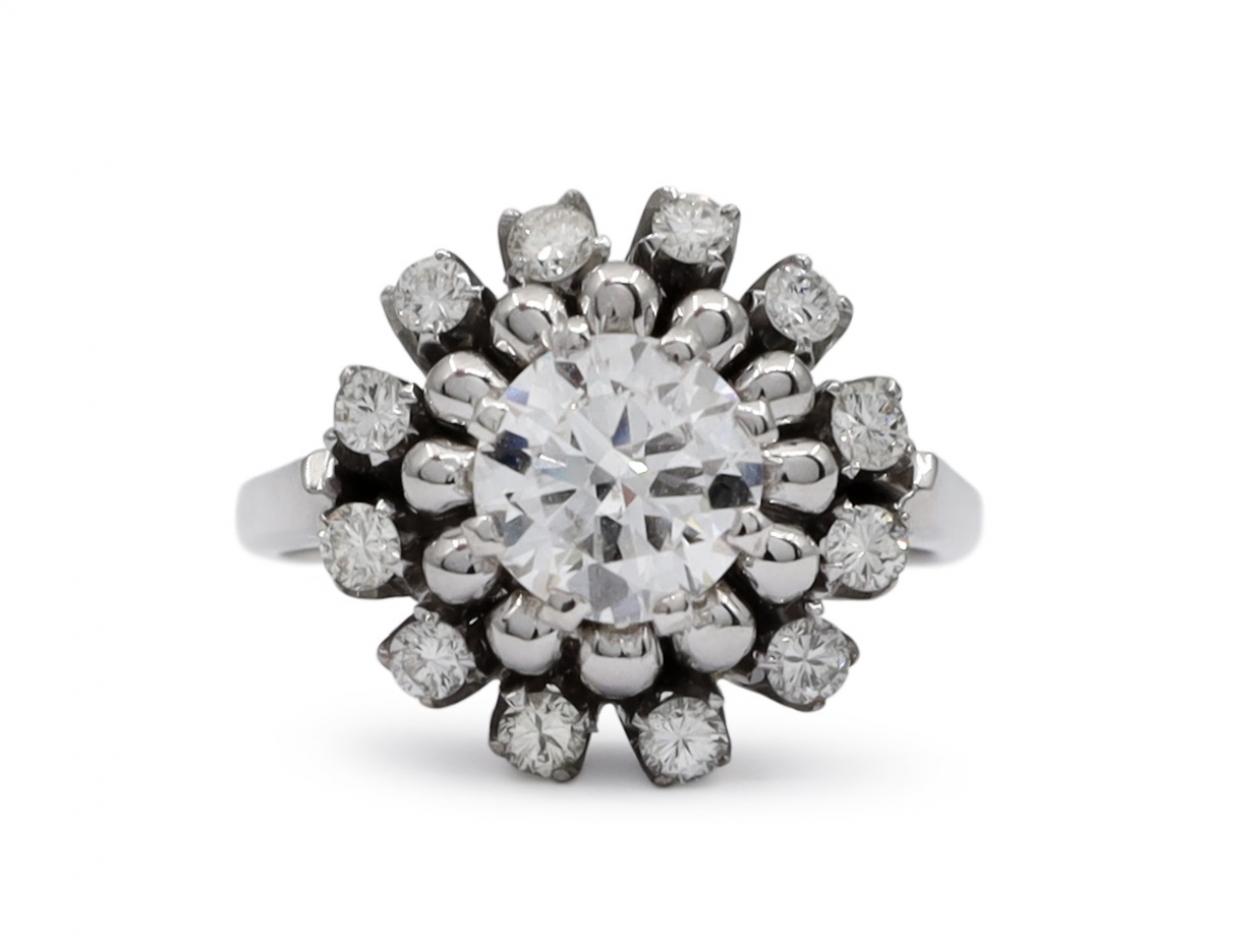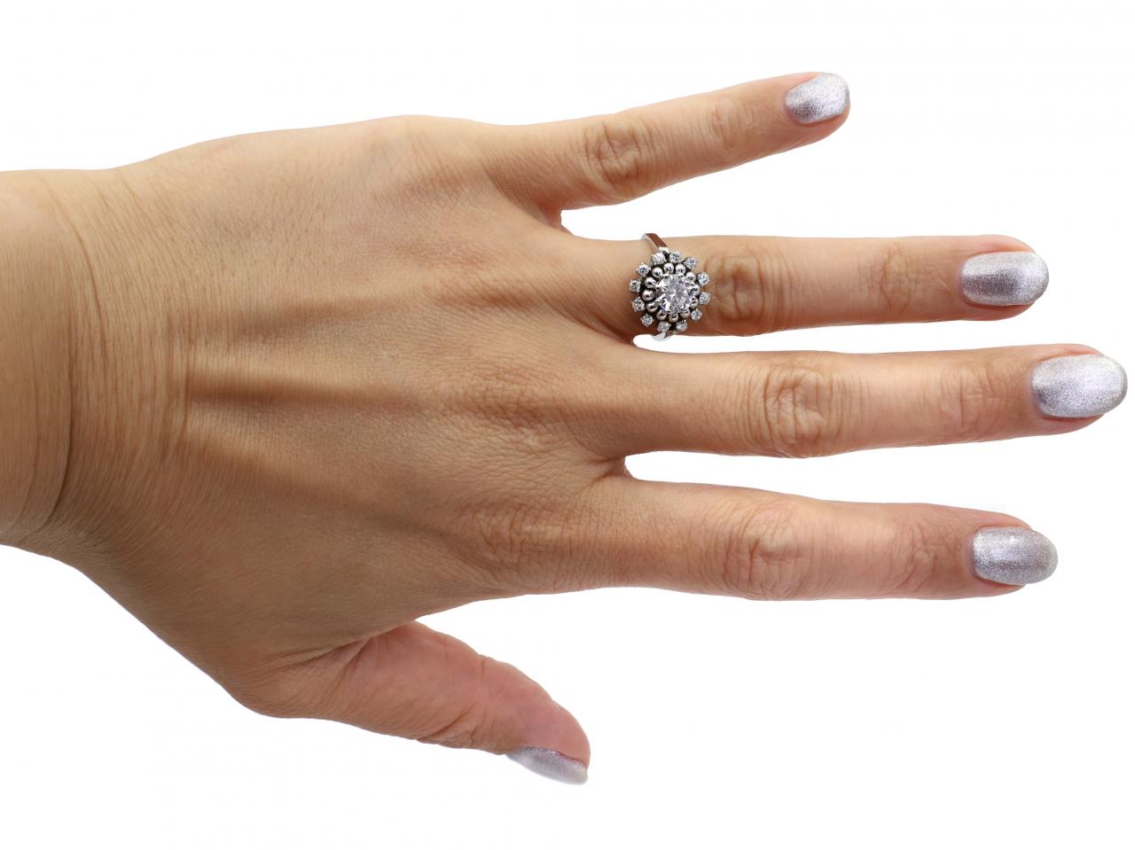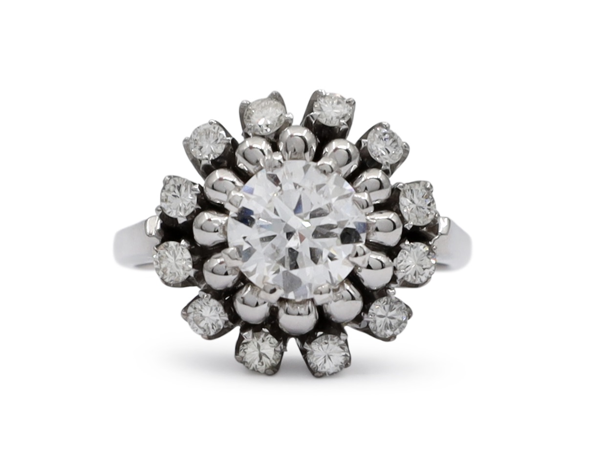 Vintage Italian 0.83ct round brilliant cut diamond cluster ring in 18kt white gold. Centred with an 0.83ct round brilliant cut diamond, F/G colour, SI clarity in a raised claw setting, further enhanced by twelve round brilliant cut diamonds in floating claw settings, to a circular cluster design featuring curving claws, granulation and structured gallery, met to either side with raised shoulders which flow to a solid shank. Marked 18kt gold.
