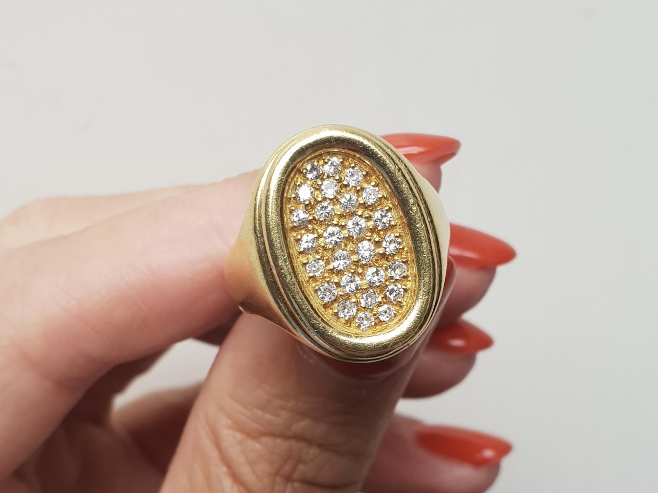 Vintage Italian diamond oval plaque ring in 18kt yellow gold. Set with twenty-six round brilliant cut diamonds in pave settings, to an inset oval cluster design featuring neat settings, framed by a raised tubed border and flanked by broad integrated shoulders which taper to a solid shank. Estimated total diamond weight 0.25cts. Hallmarked 18kt gold, Italian.