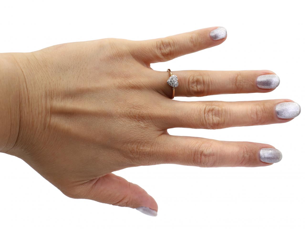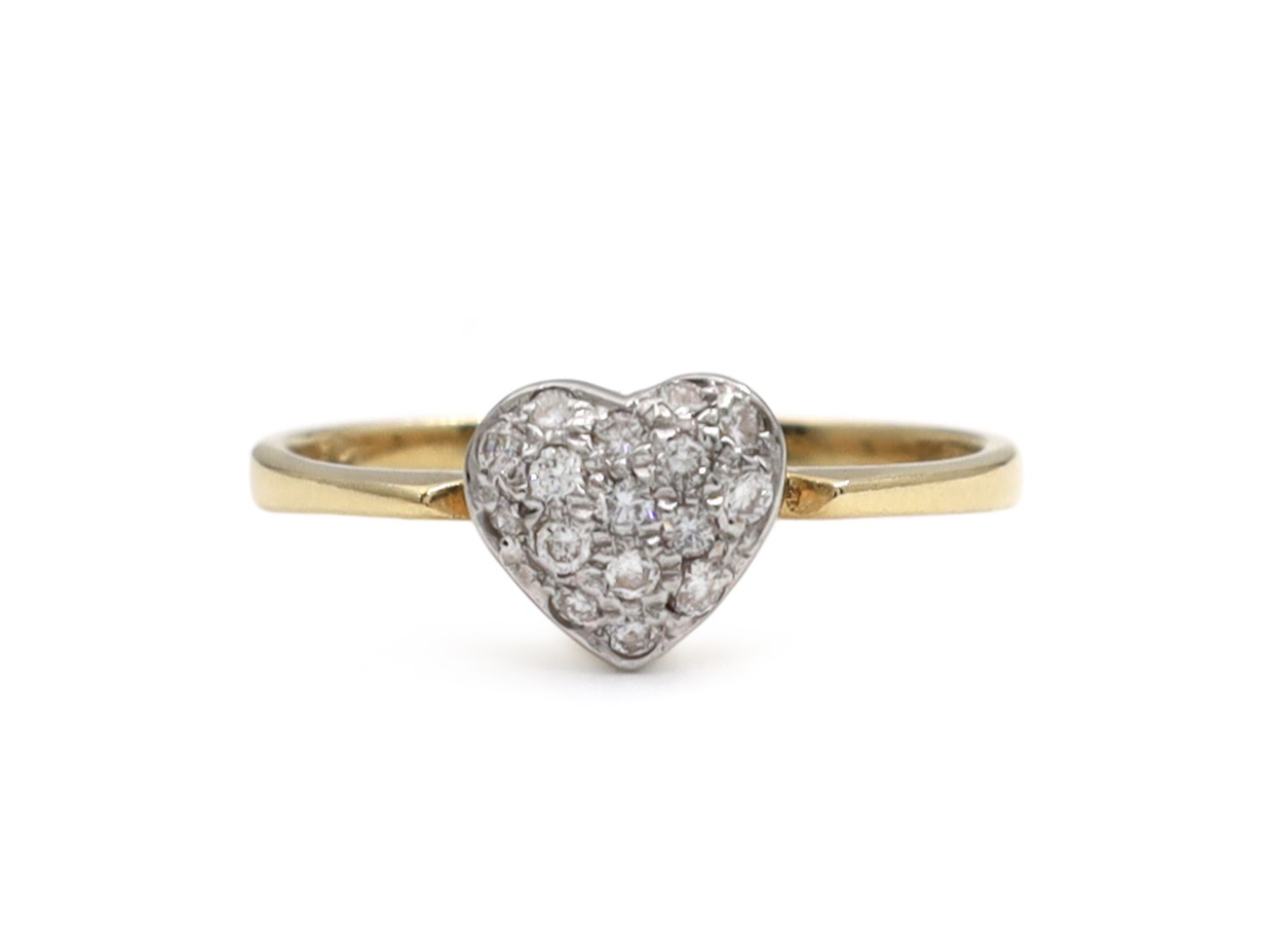 Vintage Italian diamond set heart cluster ring in 18kt gold. Set with fifteen round brilliant cut diamonds in grain settings, to a heart motif cluster design featuring a smooth enclosed gallery, and met to either side with pointed shoulders with inward tapering that broadens to a solid shank. Hallmarked 18kt gold, Italian.