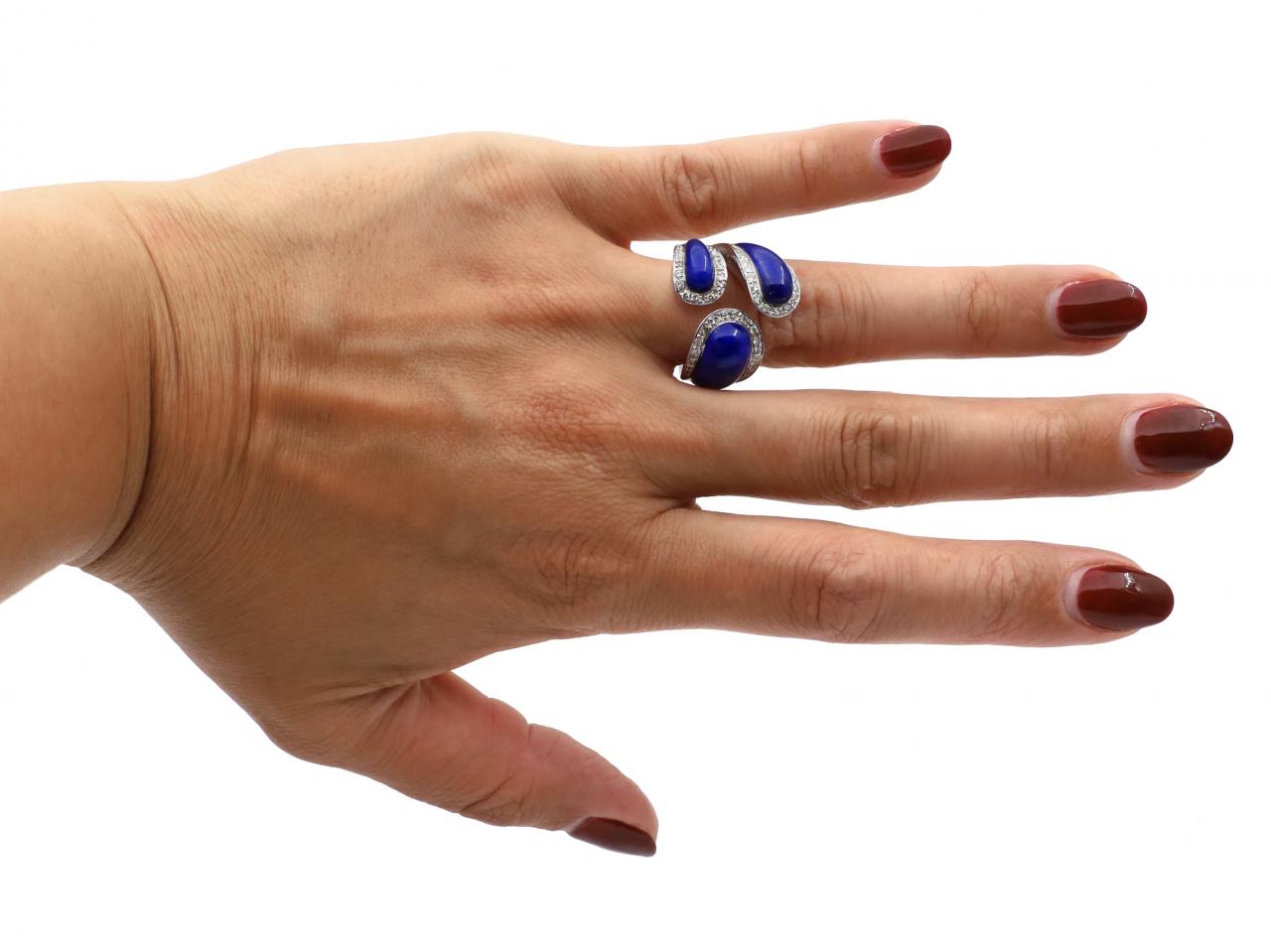 Vintage Italian lapis lazuli and diamond cocktail ring in 18kt white gold. An openwork design consisting of three carved lapis lazuli in rubover settings, each bordered with a row of round brilliant cut diamonds in grain settings, to an interesting staggered open armed design with polished sides and shoulders which join to a solid shank. Hallmarked 18kt gold.