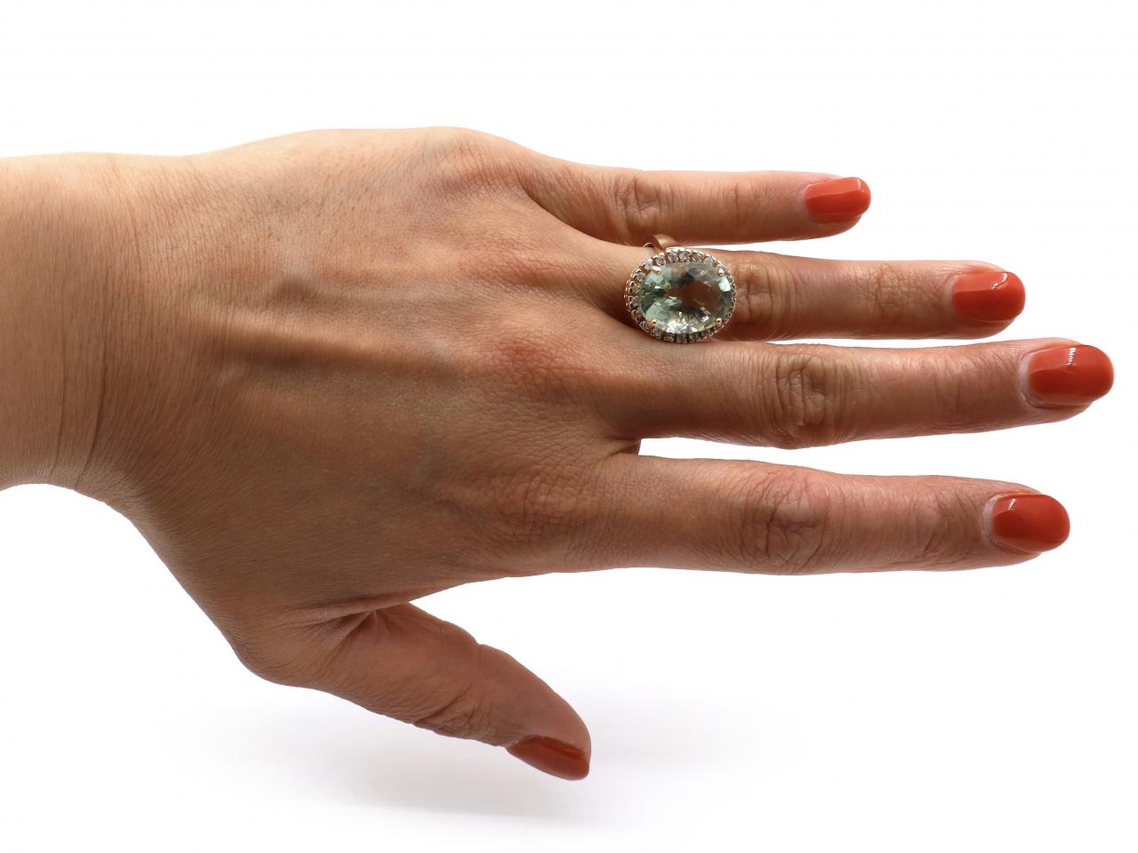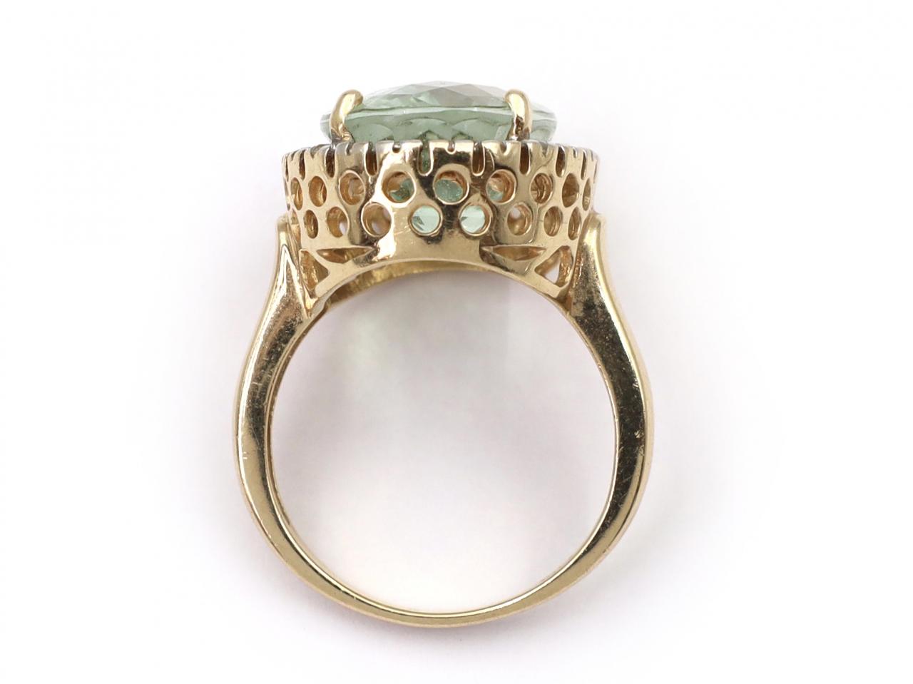 Vintage light green quartz and diamond dress ring in 14kt gold. Centrally set with an oval mixed cut light green quartz in a slightly raised four claw setting, encircled by a single row of round diamonds in claw settings, to a large raised oval cluster design with curving claws and pierced open gallery, flanked to either side with trumpeting shoulders which smooth to a solid shank. Marked 14kt gold.
