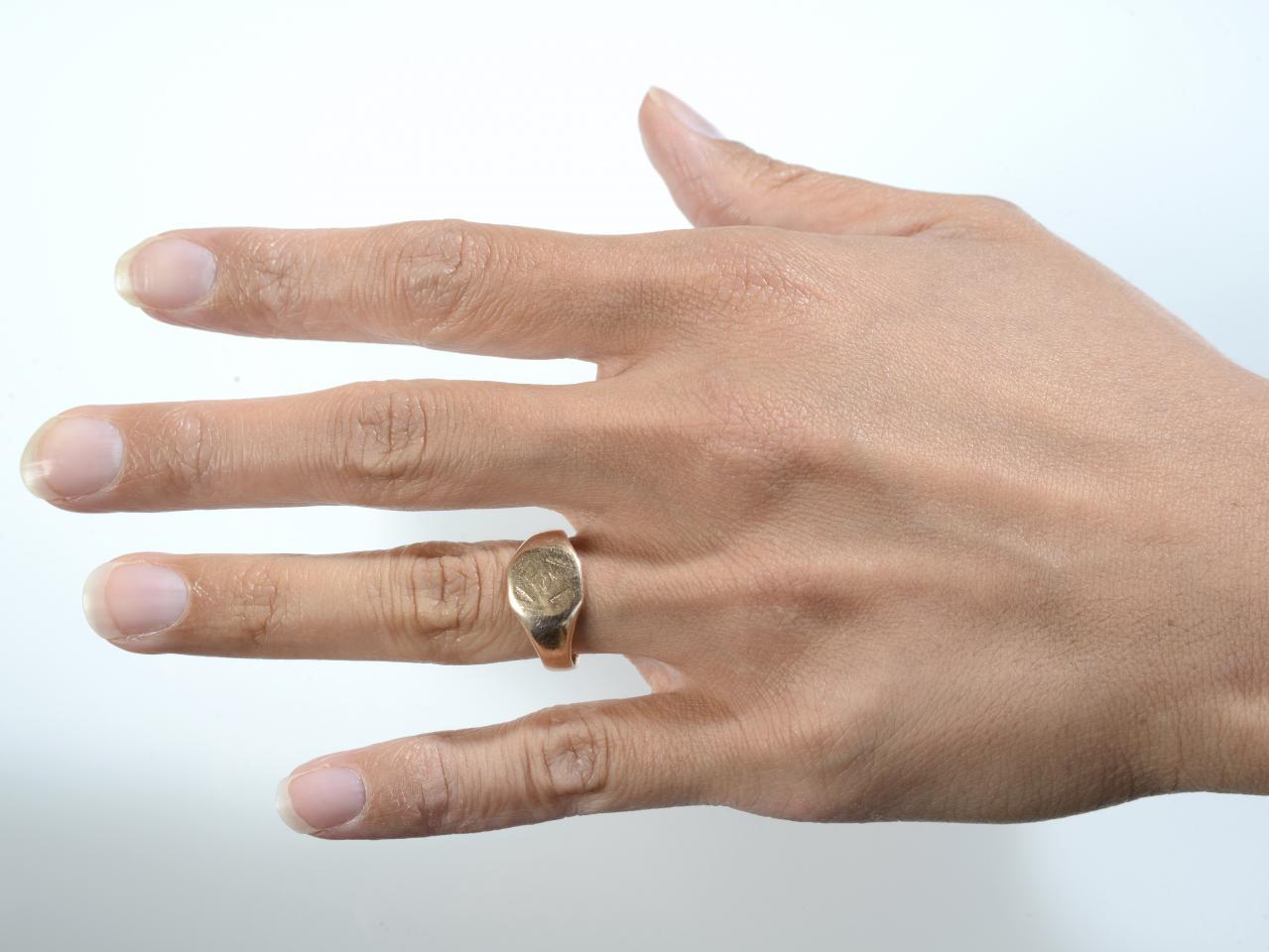 Vintage Masonic 9kt yellow gold signet ring, a gents signet ring with a cushion shape plaque to the centre featuring a rubbed Free Mason symbol, flanked by broad trumpeting shoulders which smooth to a solid shank. Marked 9kt gold.