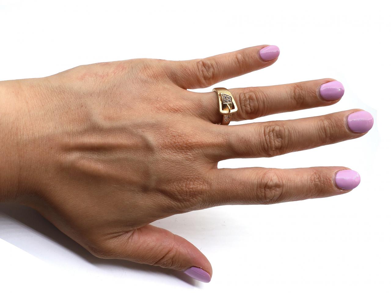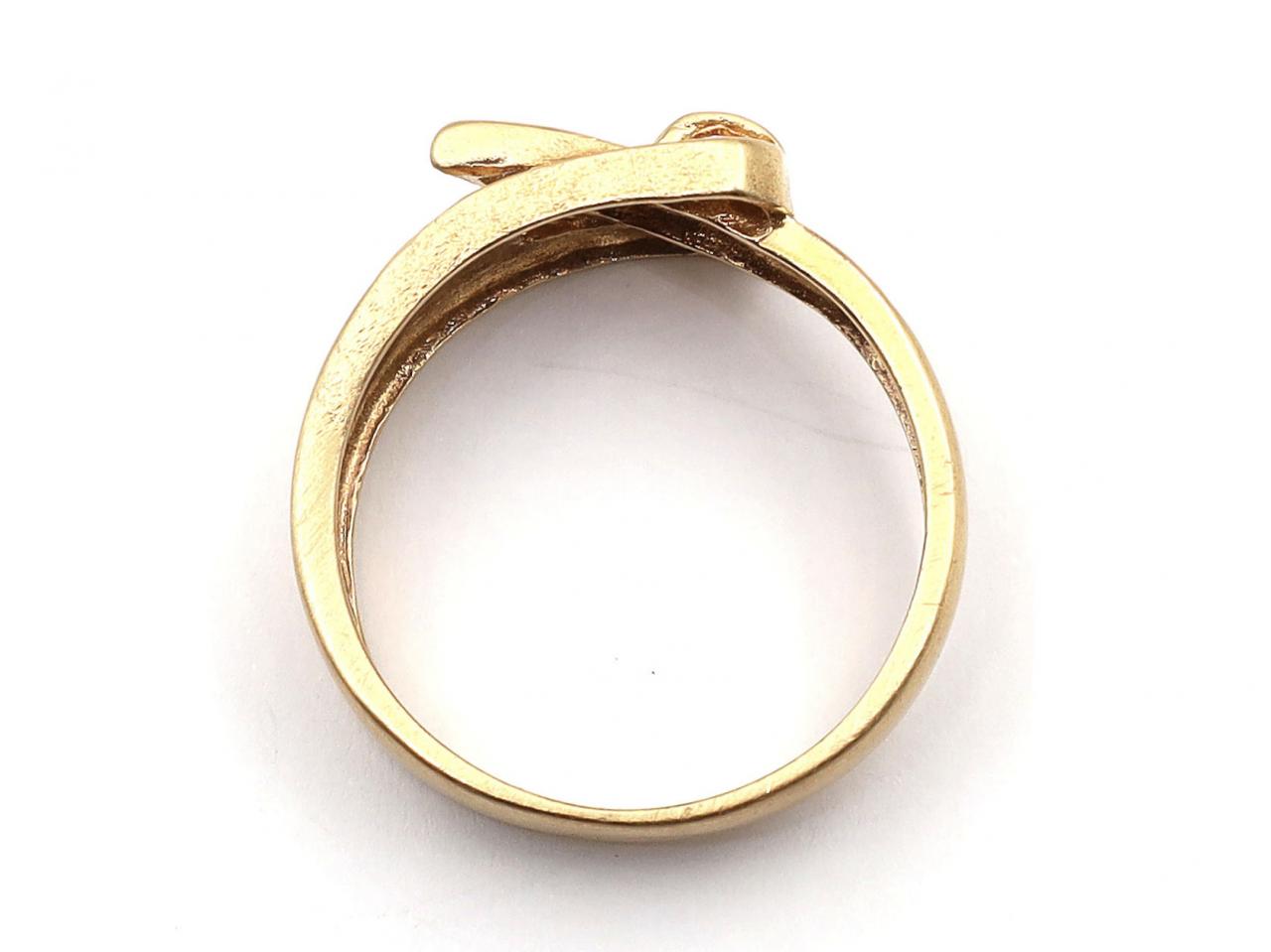 Vintage matte 18kt yellow gold and diamond buckle ring. Centred with an open work buckle motif set with eight round eight cut diamonds in grain settings, terminating to a matte finish shank. Hallmarked 18kt gold.