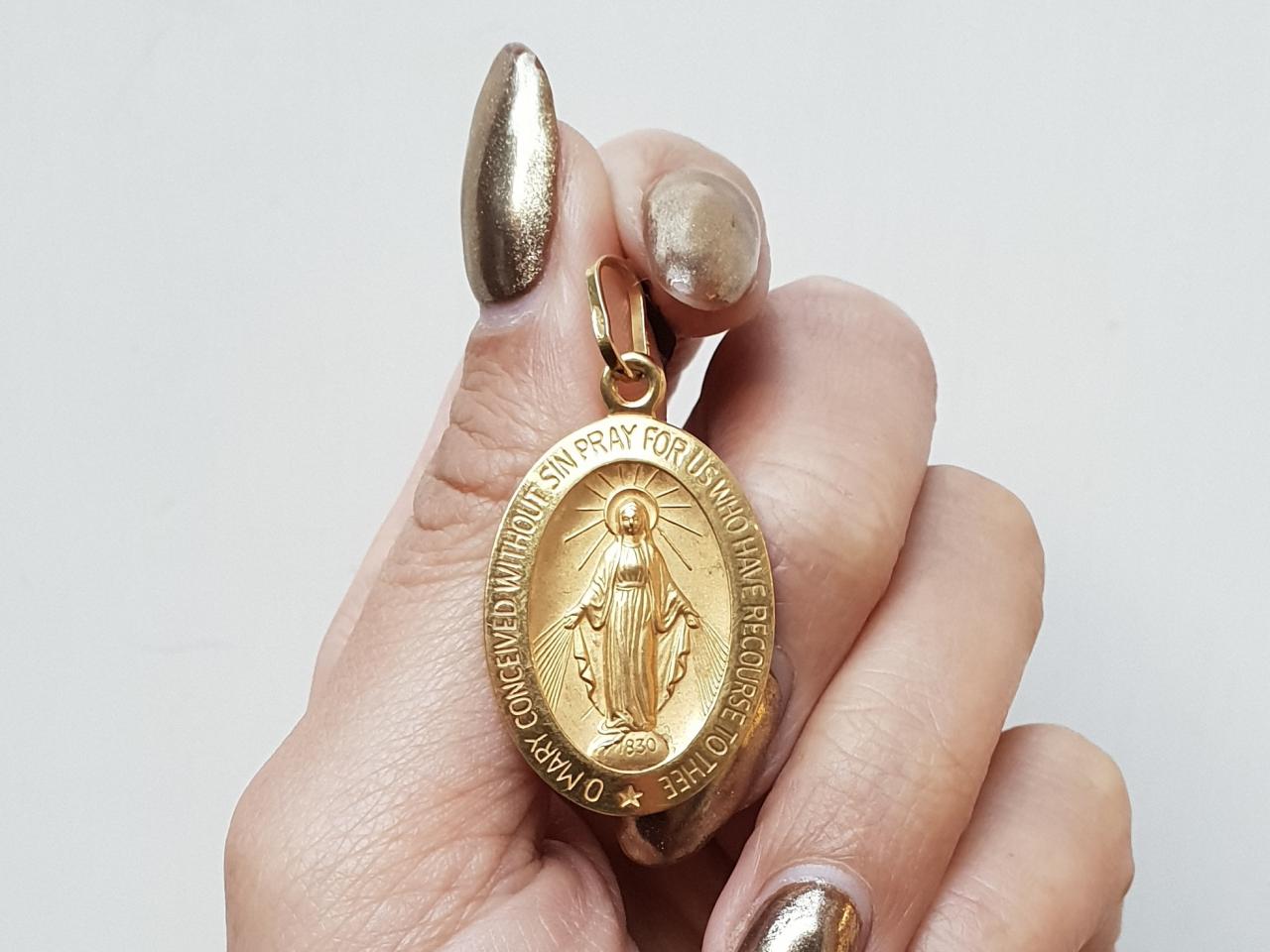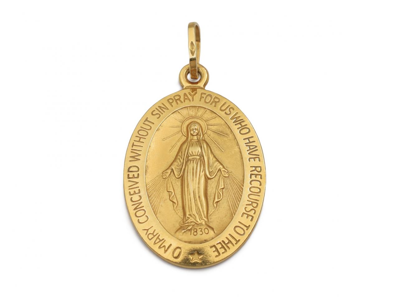 Vintage miraculous medal in 18kt yellow gold. An oval plaque featuring the virgin mary to the front adorned in a flowing robe, with radiating rays of light from her hands and head, bordered with the phrase 'O MARY CONCEIVED WITHOUT SIN PRAY FOR US WHO HAVE RECOURSE TO THEE', fitted to top with an oval bale.