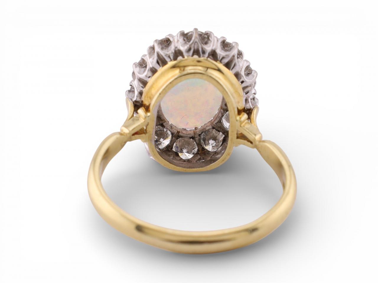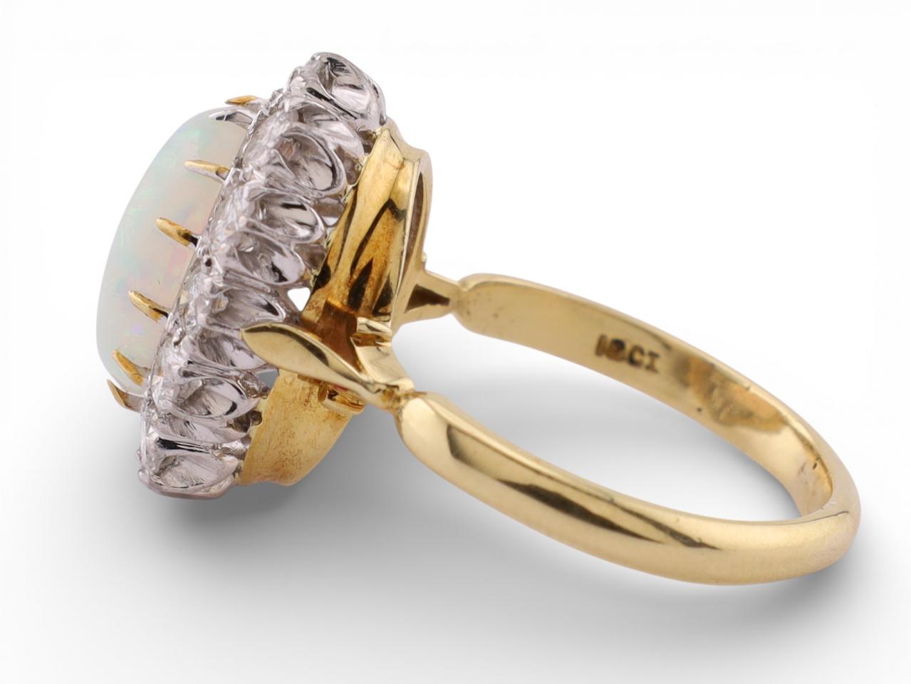 Vintage opal and diamond cluster ring in 18kt gold. This beautiful cluster ring features an estimated 1.30ct opal with bright internal colour play, surrounded by a modern round brilliant diamond halo of estimated 0.35ct total weight. Estimated colour: G, estimated clarity: I. The piece features an 18kt yellow gold shank and white gold settings.