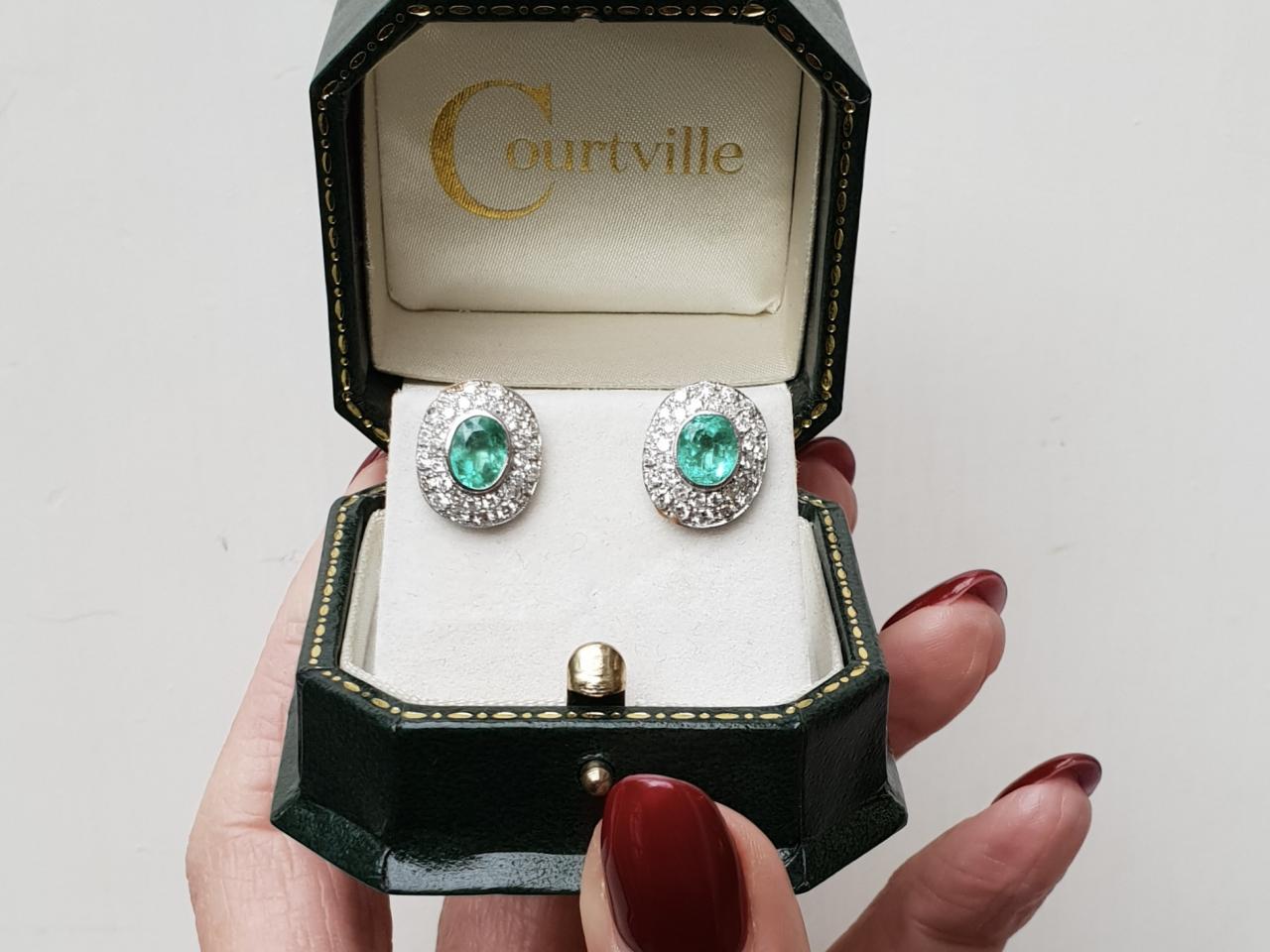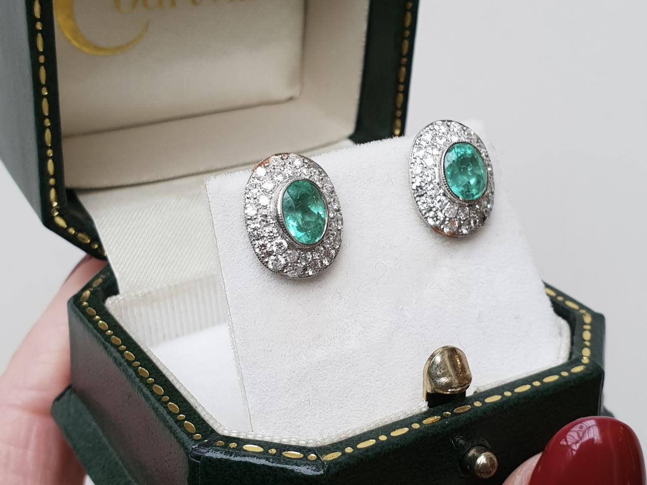 Vintage oval emerald and diamond cluster earrings in 18kt white gold. A matching pair of earrings, each centred with an oval mixed cut emerald in a millegrain setting, encircled with two rows of diamonds in grain settings, to a flush oval cluster design with millegrain borders and fitted to the reverse with a secure post and butterfly.