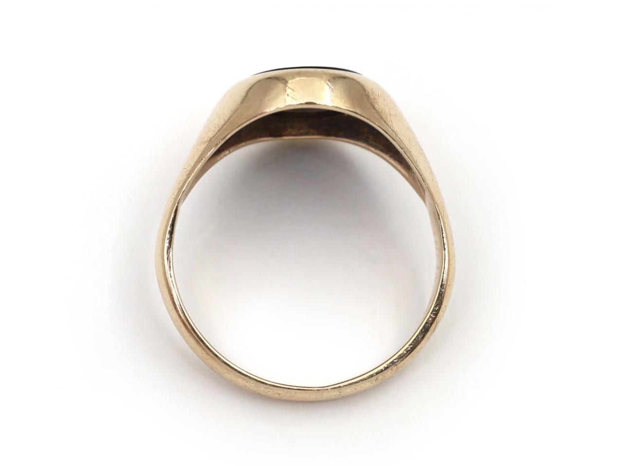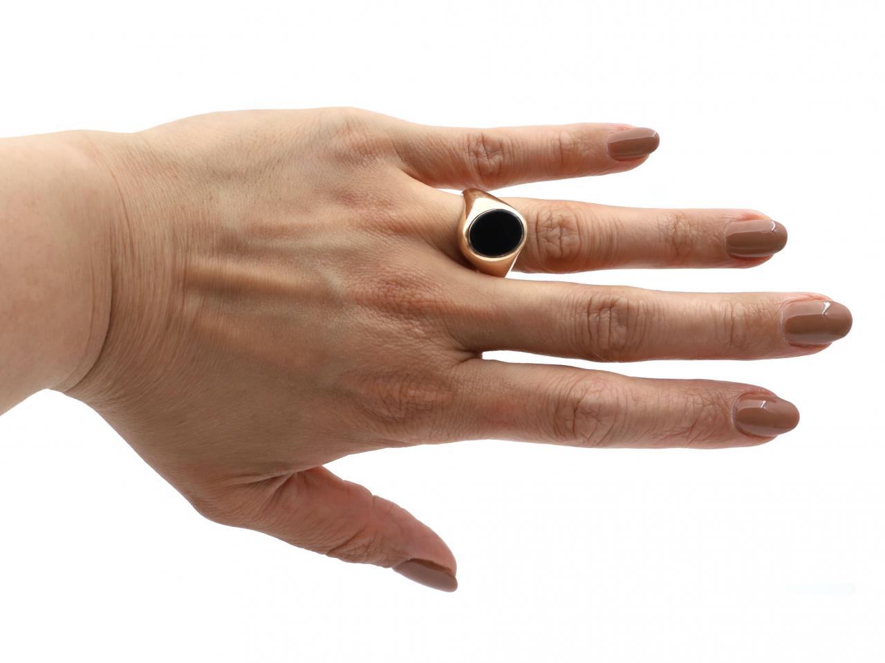 Vintage oval onyx and 9kt yellow gold signet ring. Centrally set with an oval onyx tablet in a rubover setting, to a signet design with integrated shoulders curving to a solid shank.