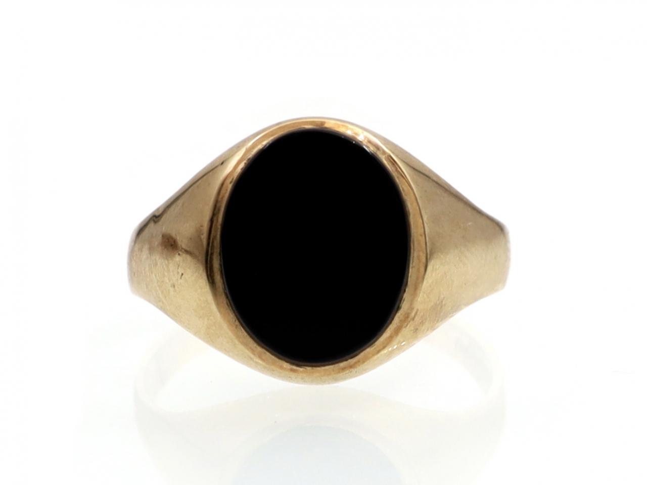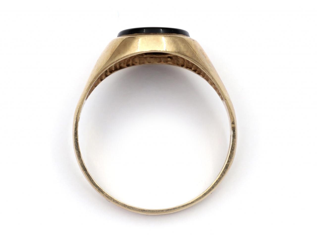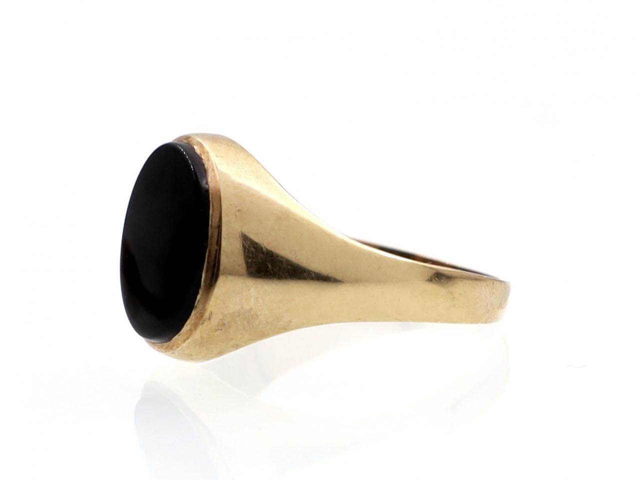 Vintage oval onyx signet ring in 9kt yellow gold. Centred with an oval onyx plaque in a rubover setting, flanked to either side with broad trumpeting shoulders which taper to a solid shank. Hallmarked 9kt gold, Sheffield, 1987.