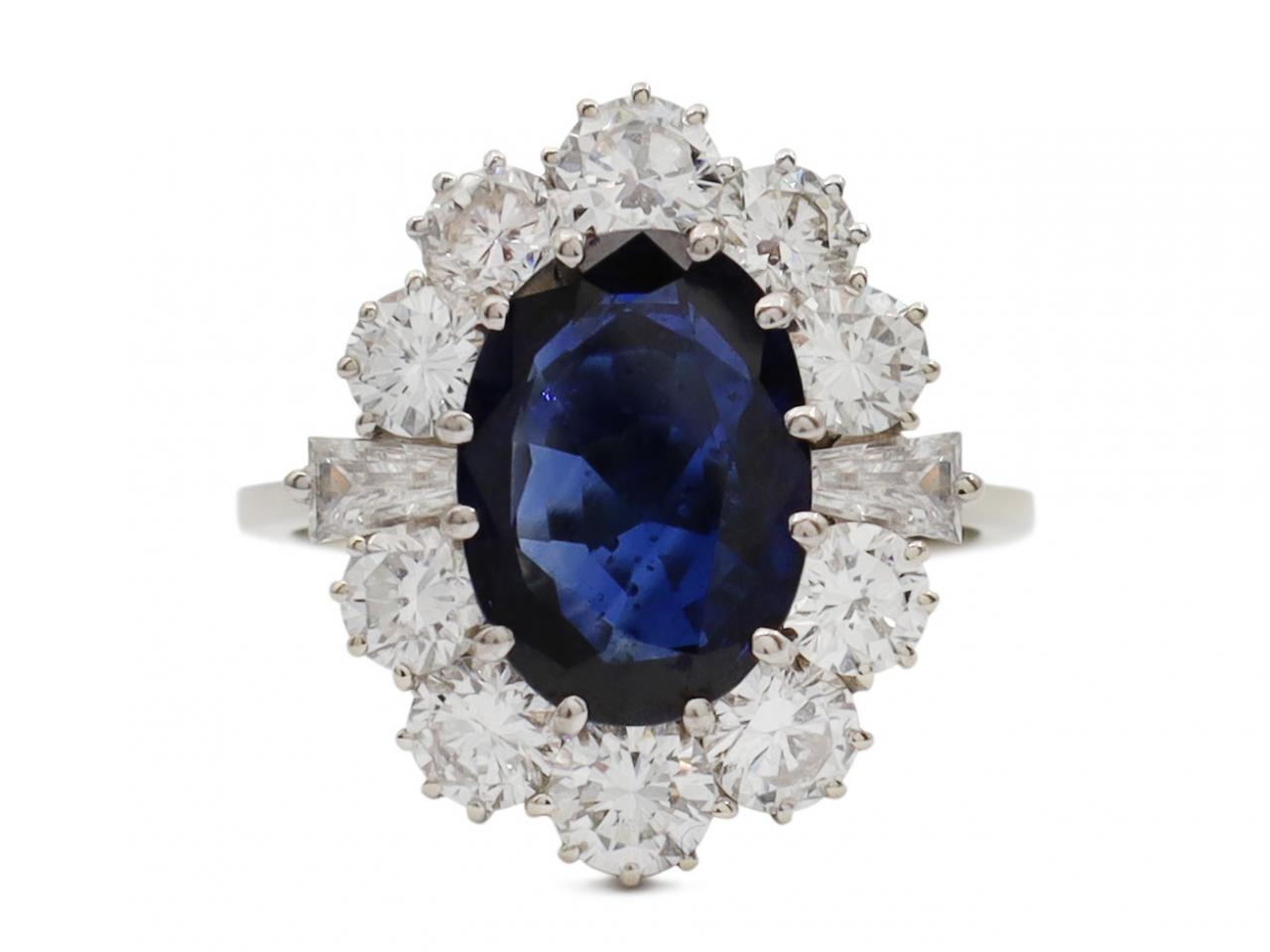 Vintage oval sapphire and diamond cluster engagement ring in 18kt white gold. Centrally set with an estimated 3.00ct oval mixed cut sapphire in a raised claw setting, set to top and bottom with a row of undulating round brilliant cut diamonds in claw settings and flanked by two tapering baguette cut diamonds in claw settings, to a large cluster ring with intricate claws, open wirework gallery and met to either side with raised inwardly tapering shoulders which smooth to a solid shank. Estimated total diamond weight 2.00cts. Marked 18kt gold.