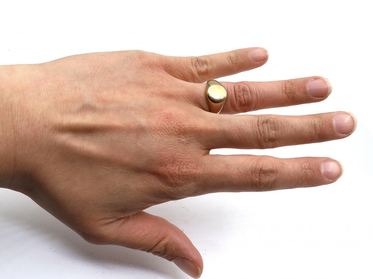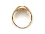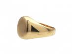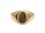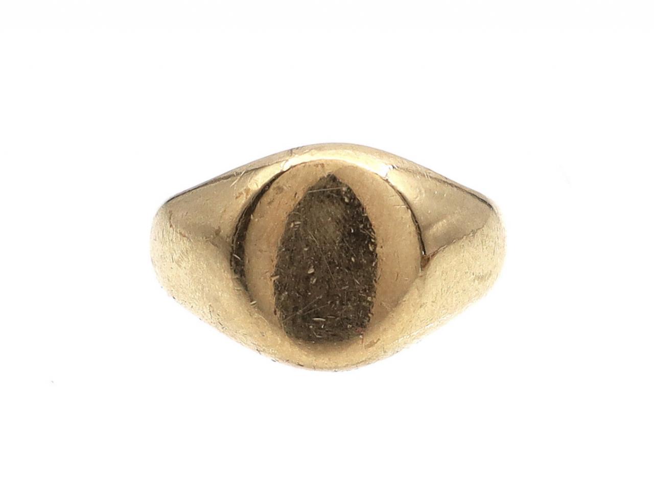 Vintage oval signet ring in 9kt yellow gold. Centred with a flat oval plaque, met to either side with broad trumpeting shoulders which smooth to a solid shank.