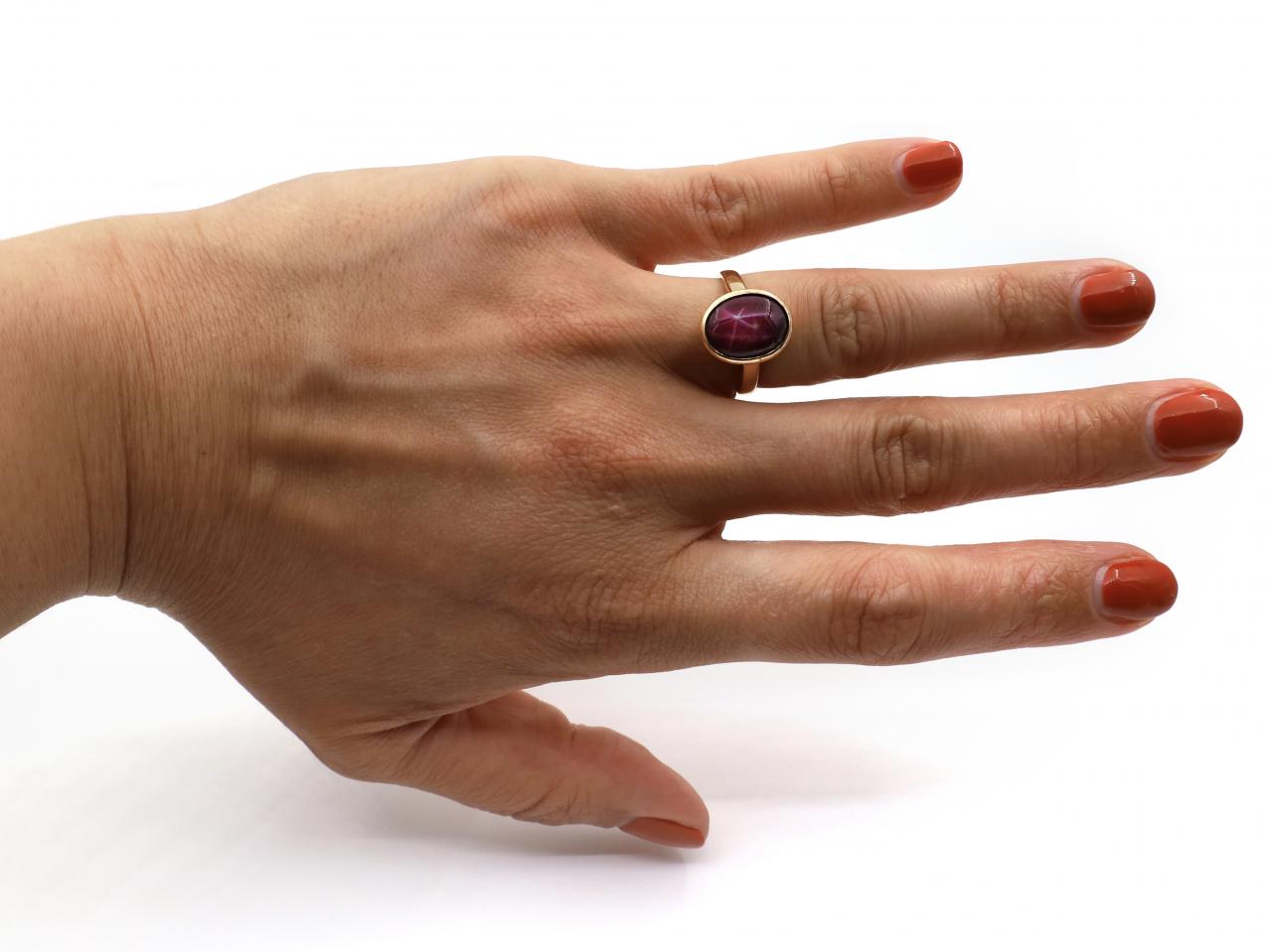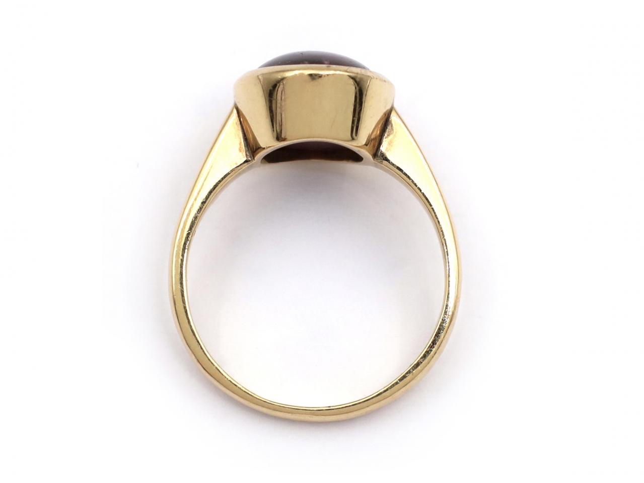 Vintage oval star ruby ring in 18kt yellow gold. Centred with an oval cabochon star ruby in a rubover setting, flanked to either side with raised shoulders which smooth to a polished shank.