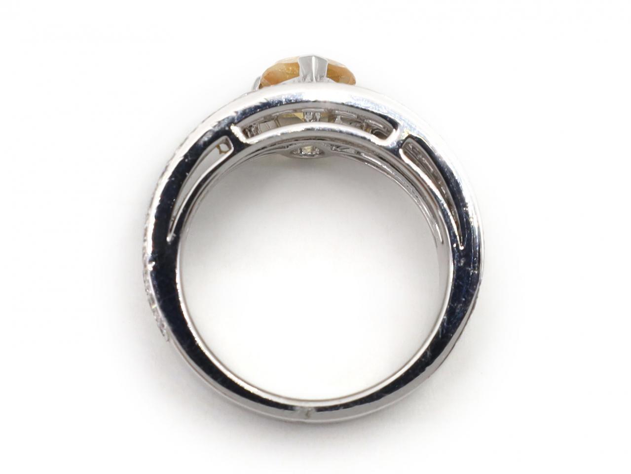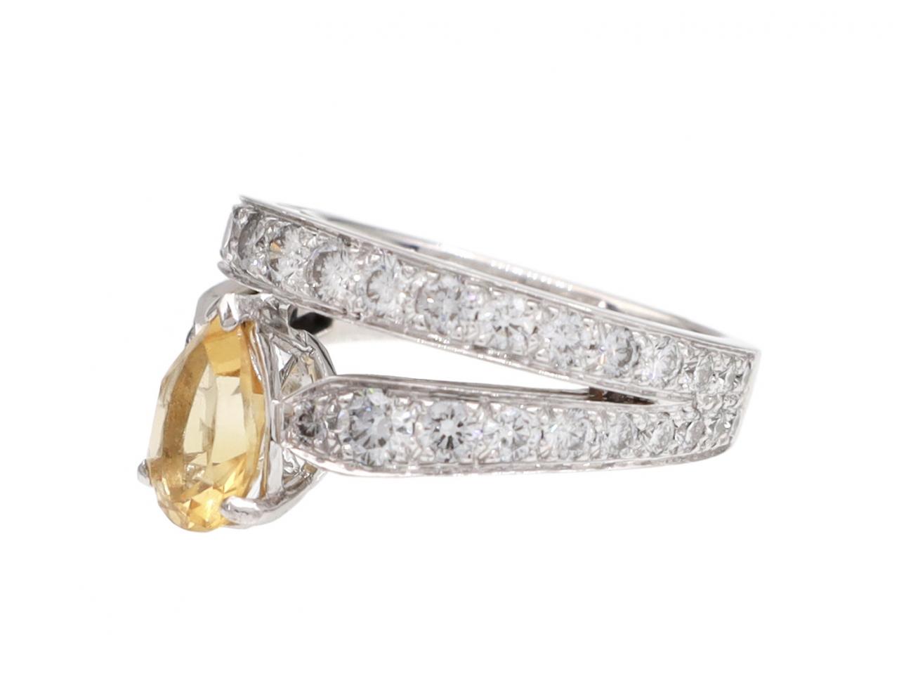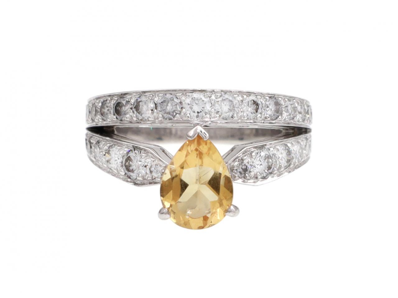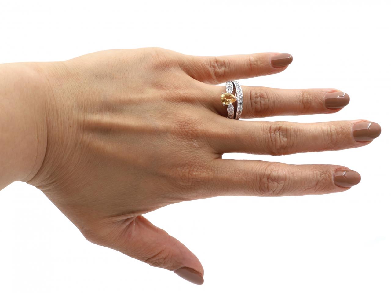 Vintage French pear fancy yellow sapphire and double diamond band engagement ring in platinum. Set with a pear shape mixed cut fancy yellow sapphire in a raised claw setting, to a unique solitaire design fitted to top with a diamond set band and flanking the central stone with inwardly tapering diamond set shoulders which both connect to a smooth solid shank. Hallmarked platinum, French.