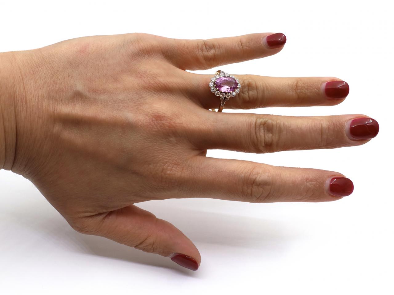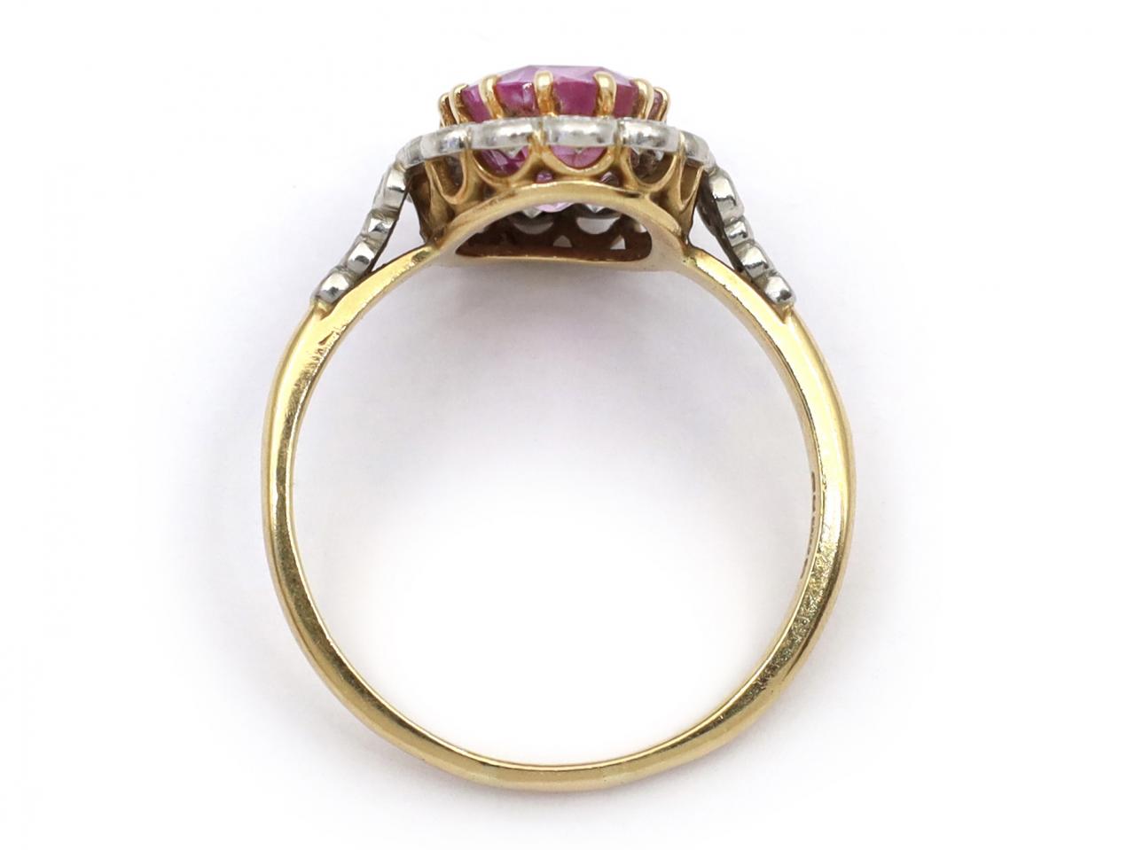 Vintage pink sapphire and diamond cluster ring in 18kt yellow gold. Centrally set with an estimated 3.70ct oval mixed cut pink sapphire in a raised claw setting, bordered by a row of round brilliant cut diamonds in millegrain and garin settings, to an oval floral cluster with curving claws, scalloped edging, open pierced gallery and flanked by split diamond set shoulders which terminate to a smooth shank. Hallmarked 18kt gold, London.
