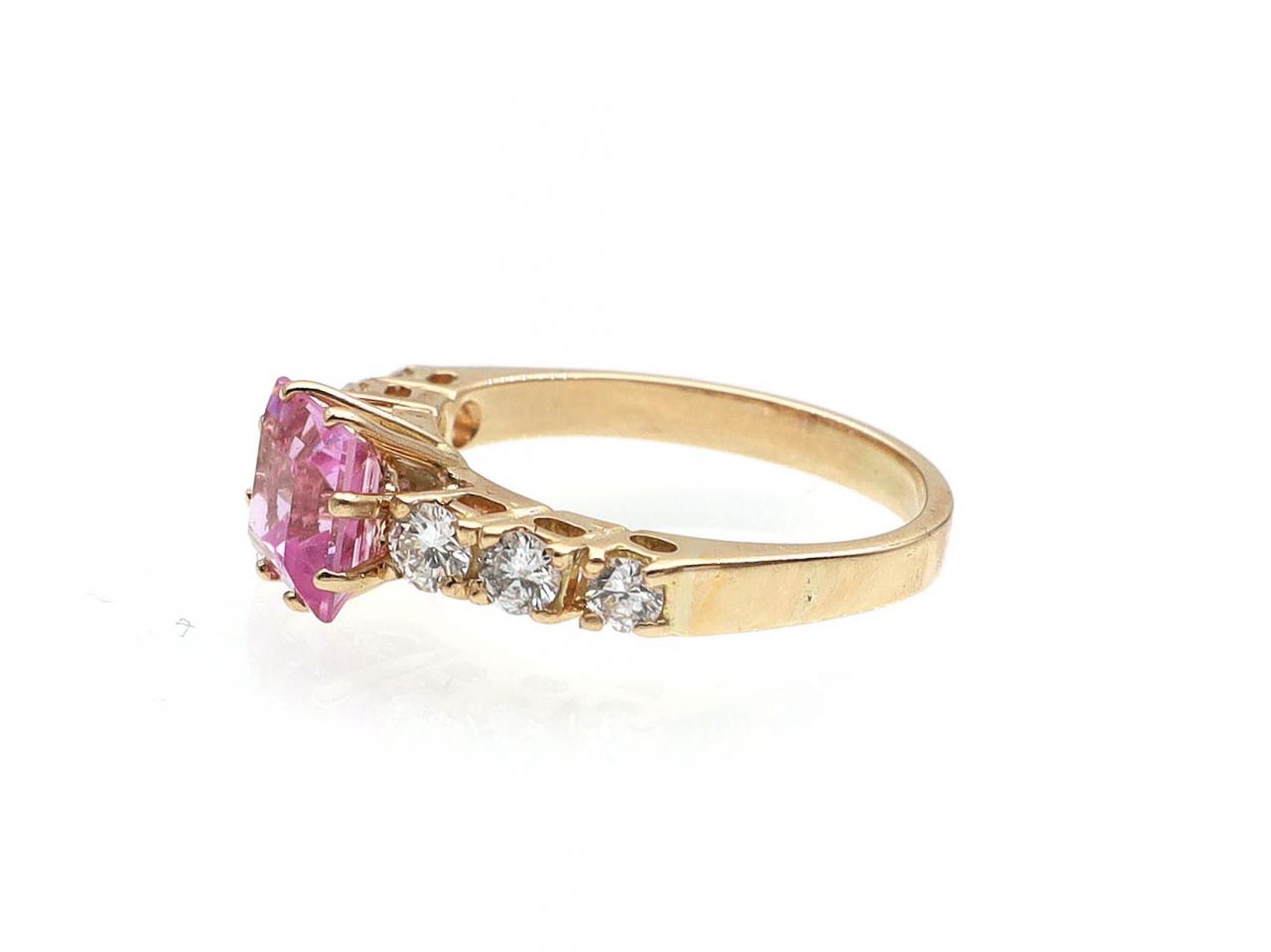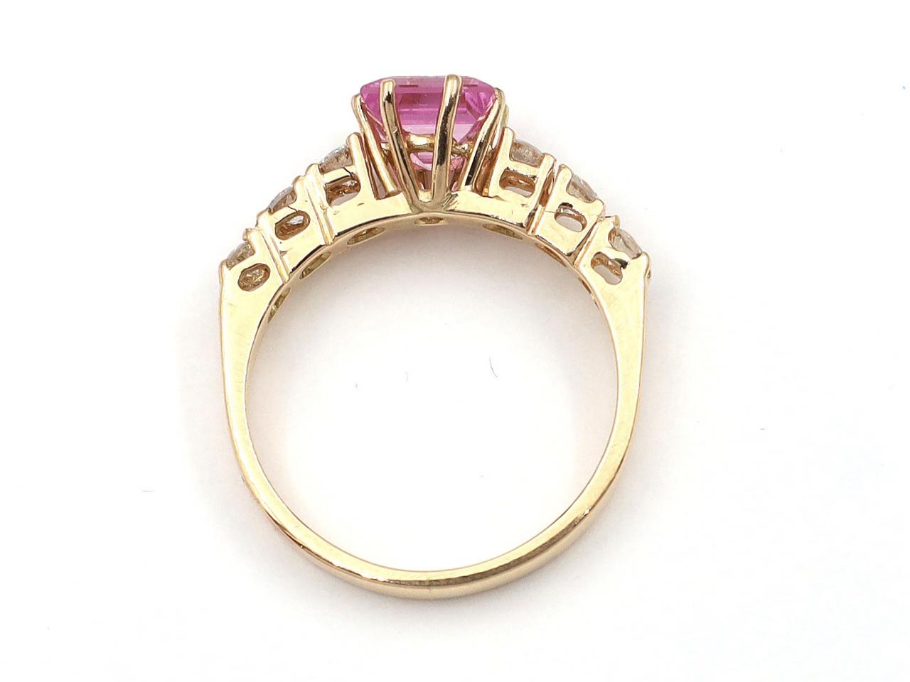 Vintage pink sapphire and diamond ring in 18kt yellow gold. Centred with a square step cut pink sapphire in a raised claw setting, flanked to either side with six round brilliant cut diamonds in claw settings, to an elegant solitaire design with pierced open gallery and terminating to a solid shank.