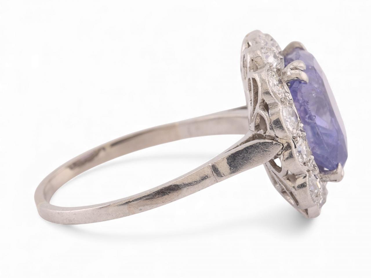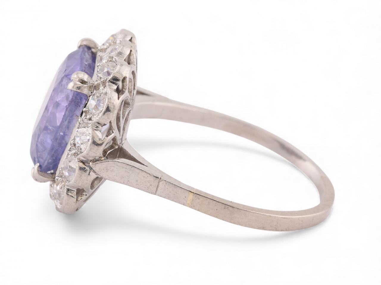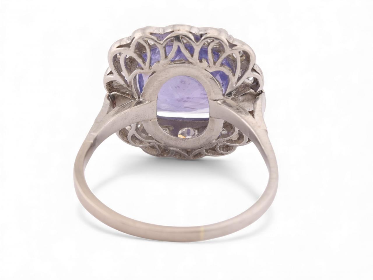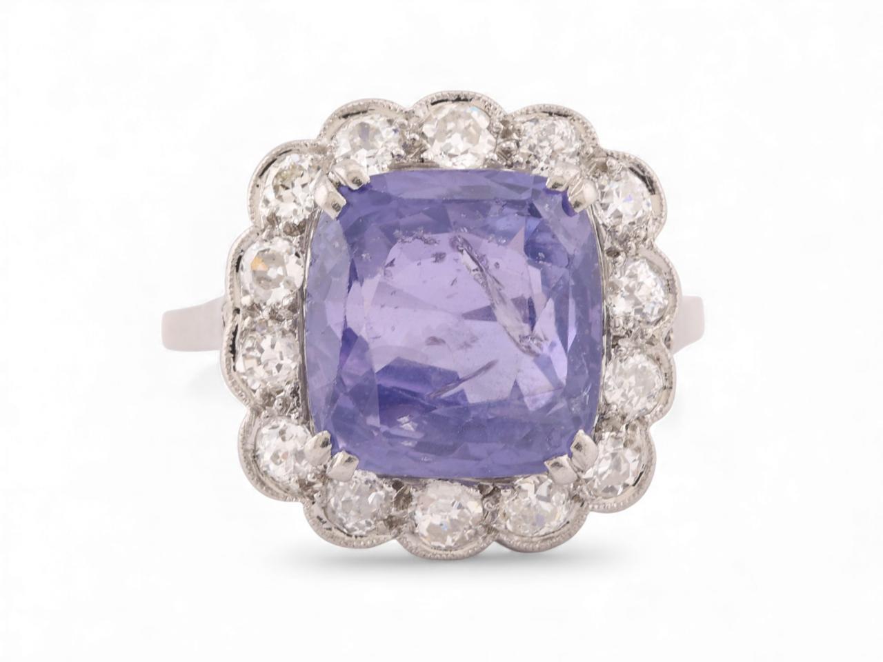 Vintage cluster ring in platinum set with a cushion shaped purple sapphire. The stone shows a slight change of colour when viewed in daylight or fluorescent light compared to incandescent light. It is surrounded by a cluster of old cut diamonds in a scalloped border. The ring features carved openwork detailing to the gallery and a slim platinum band. A classic vintage design with a distinctive purple sapphire centre.