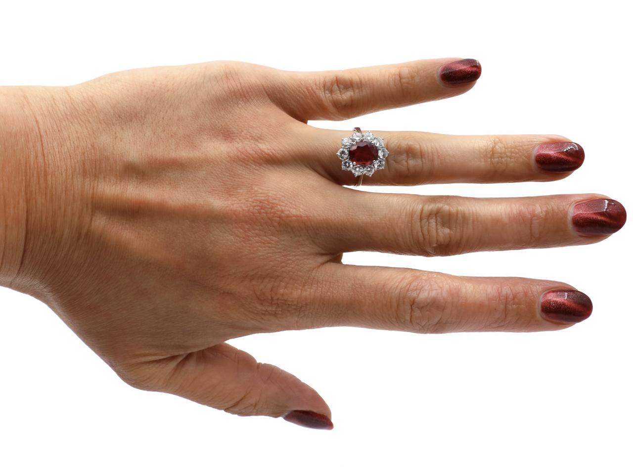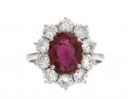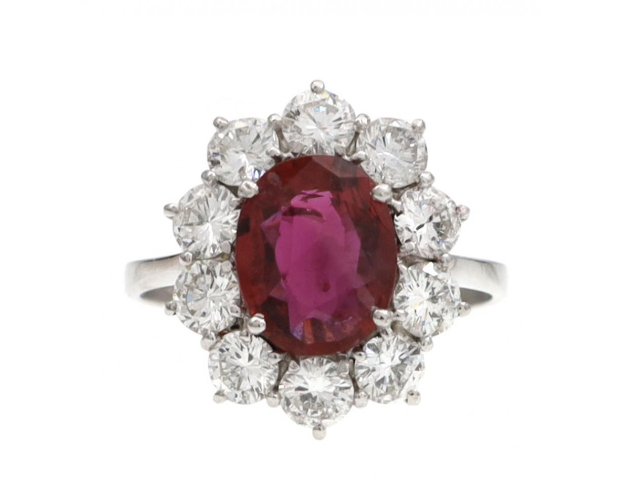 Vintage ruby and diamond coronet cluster ring in 18kt white gold. Set with an estimated 2.00ct oval mixed cut ruby in a four claw setting, encircled by a row of ten round brilliant cut diamonds in claw settings, to an oval cluster with curving claws, openwork gallery and smooth inwardly tapering shoulders which flow to a solid shank. Estimated total diamond weight 1.10cts. Marked 18kt gold.