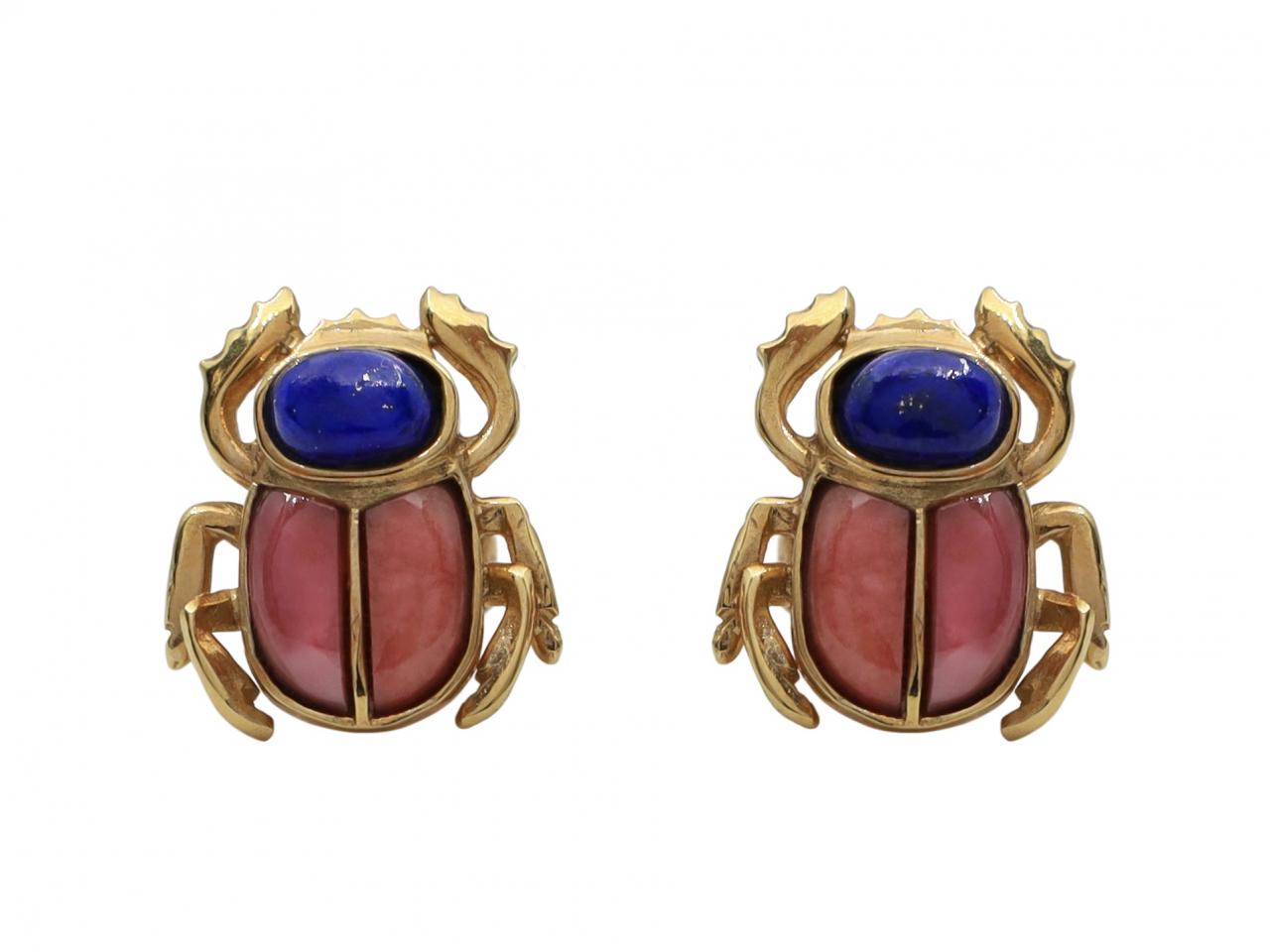 Vintage scarab beetle earrings set with rhodochrosite and lapis lazuli in 18kt yellow gold. A matching pair of earrings, each set with two oval cabochon cut lapis lazuli in rubover settings, further decorated with four fancy shaped rhodochrosites in rubover settings, to a detailed scarab beetle motif featuring polished borders, flared legs and fitted to the reverse with a secure post and butterfly. Marked 18kt gold.
