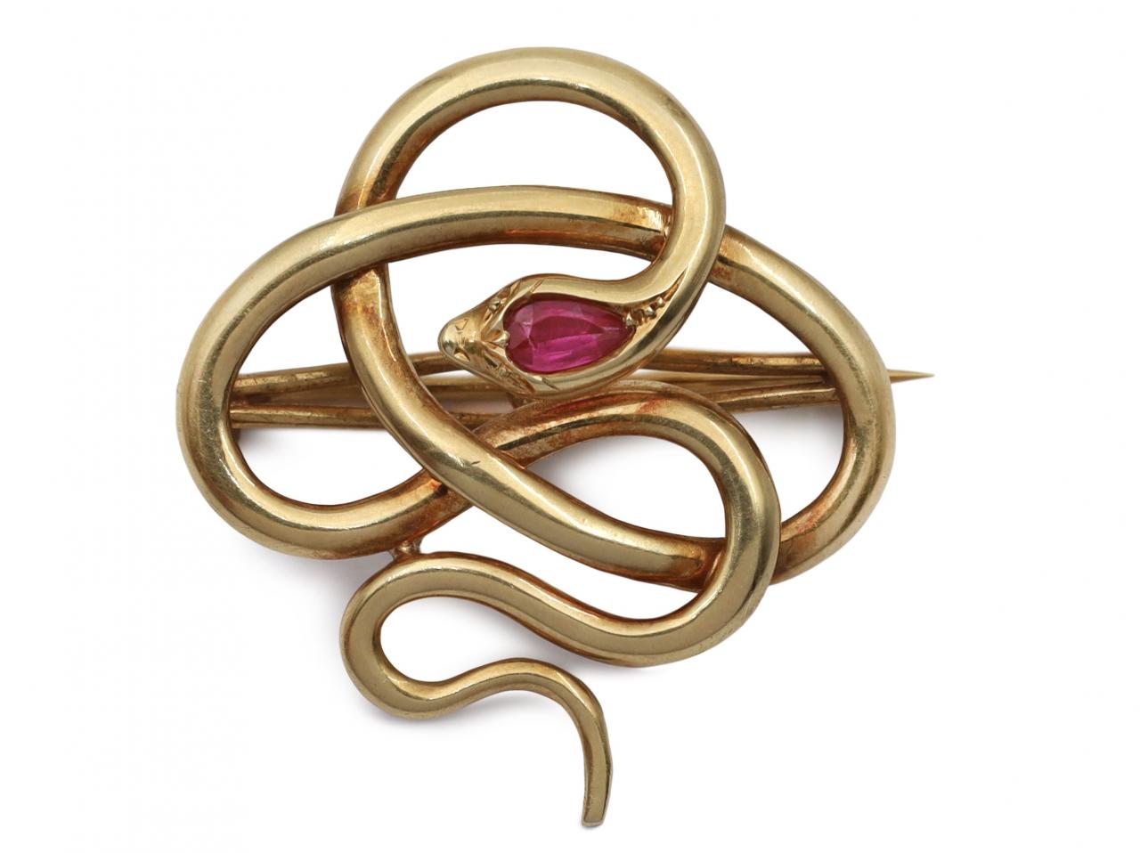 Vintage serpent brooch set with a synthetic ruby in 14kt gold