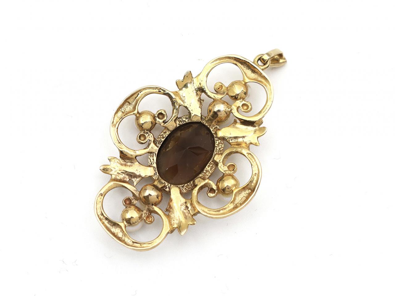 Vintage smokey quartz and pearl open work pendant in yellow gold. Centred with an oval smokey quartz in a claw setting, set to the cross section with cultured pearls, to a stylised quatrefoil openwork design with srolling, gradulation and engraved leaf motifs, suspended from a tapering ribbed bale.