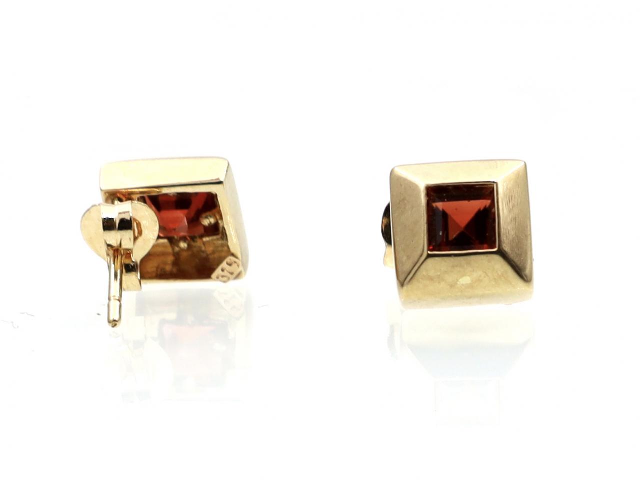 Vintage square garnet stud earrings in 9kt yellow gold. A matching pair of earrings, Each consisting of a square step cut garnet in a rubover setting, bordered by a thick polished gold frame, fitted to reverse with a secure post and butterfly. Marked 9kt gold.
