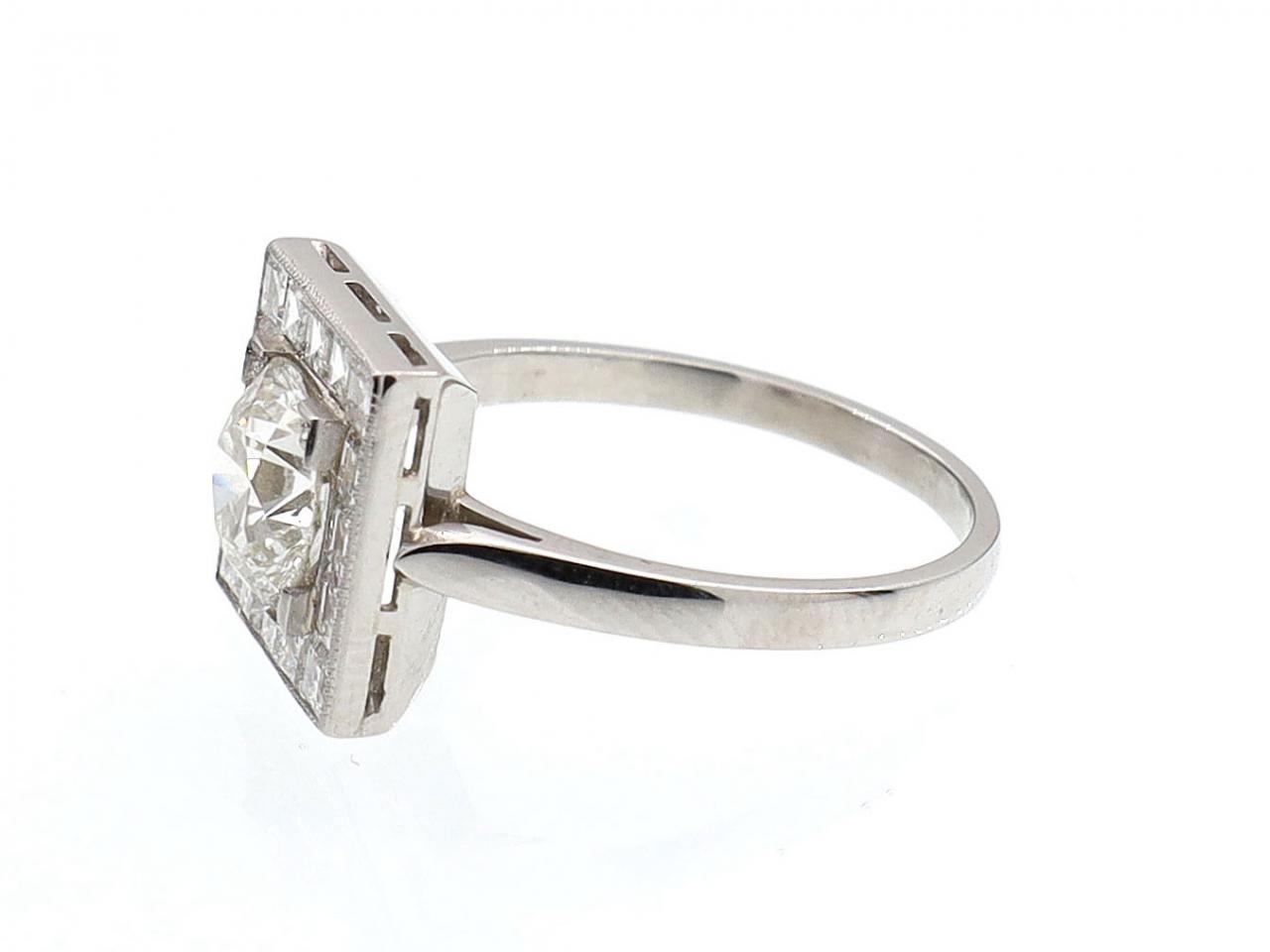 Vintage style diamond square cluster ring in platinum. Centred with a 1.00ct round brilliant cut diamond in a slightly raised four claw setting, surrounded by a square border of square carre cut diamonds in millegrain channel settings, to a geometric cluster with pierced linear gallery and flanked to either side with raised inwardly tapering shoulders which curve to a slim shank.