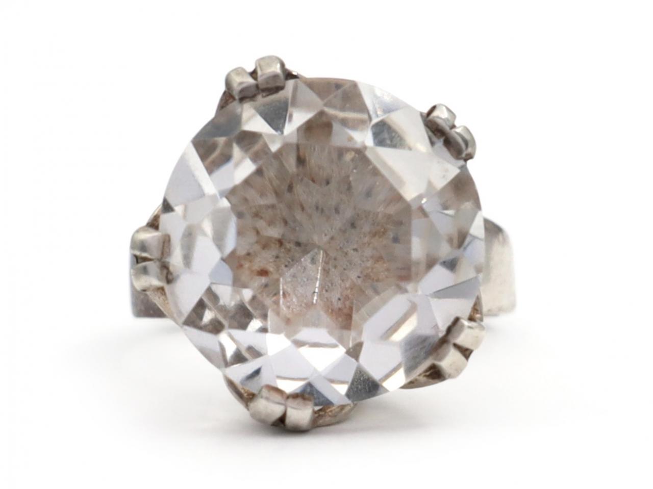 Vintage Swedish sterling silver and rock crystal cocktail ring. Set with a round fancy cut rock crystal in a openwork split claw collet setting flanked by broad trumpeting shoulders which taper and curve to a solid shank. Hallmarked sterling silver, Sweden.
