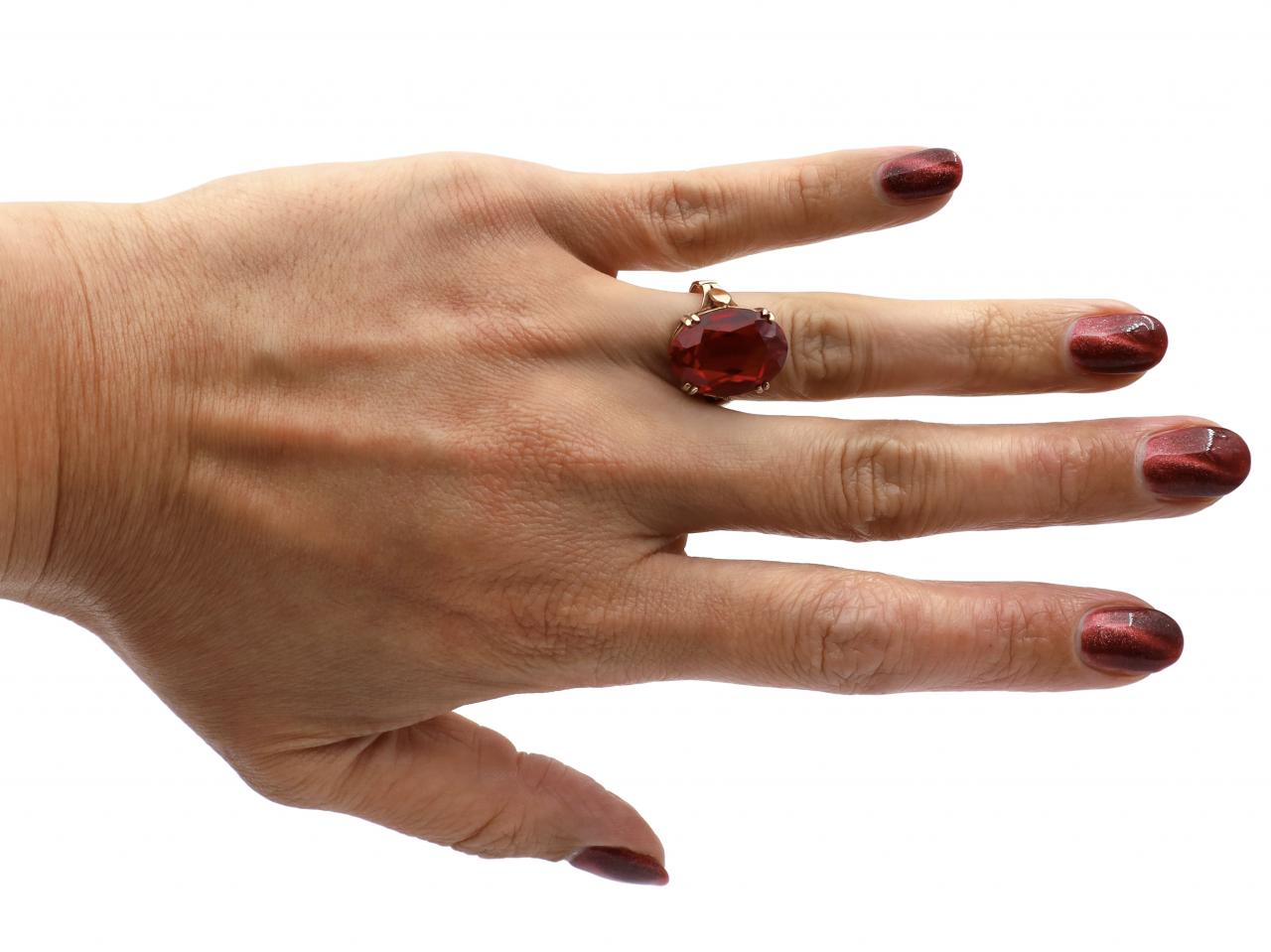 Vintage synthetic ruby dress ring in 9kt yellow gold. Set with an oval mixed cut synthetic ruby in a split claw setting, to a stylish dress ring design with an openwork collet, curving claws and flanked to either side with raised inwardly tapering shoulders which smooth to a solid shank. Hallmarked 9kt gold, Dublin.