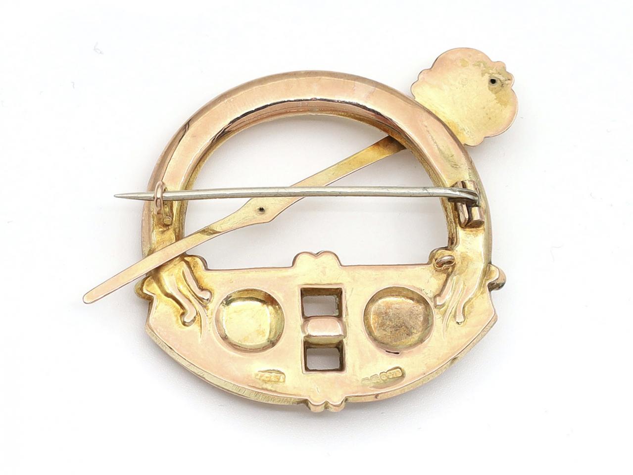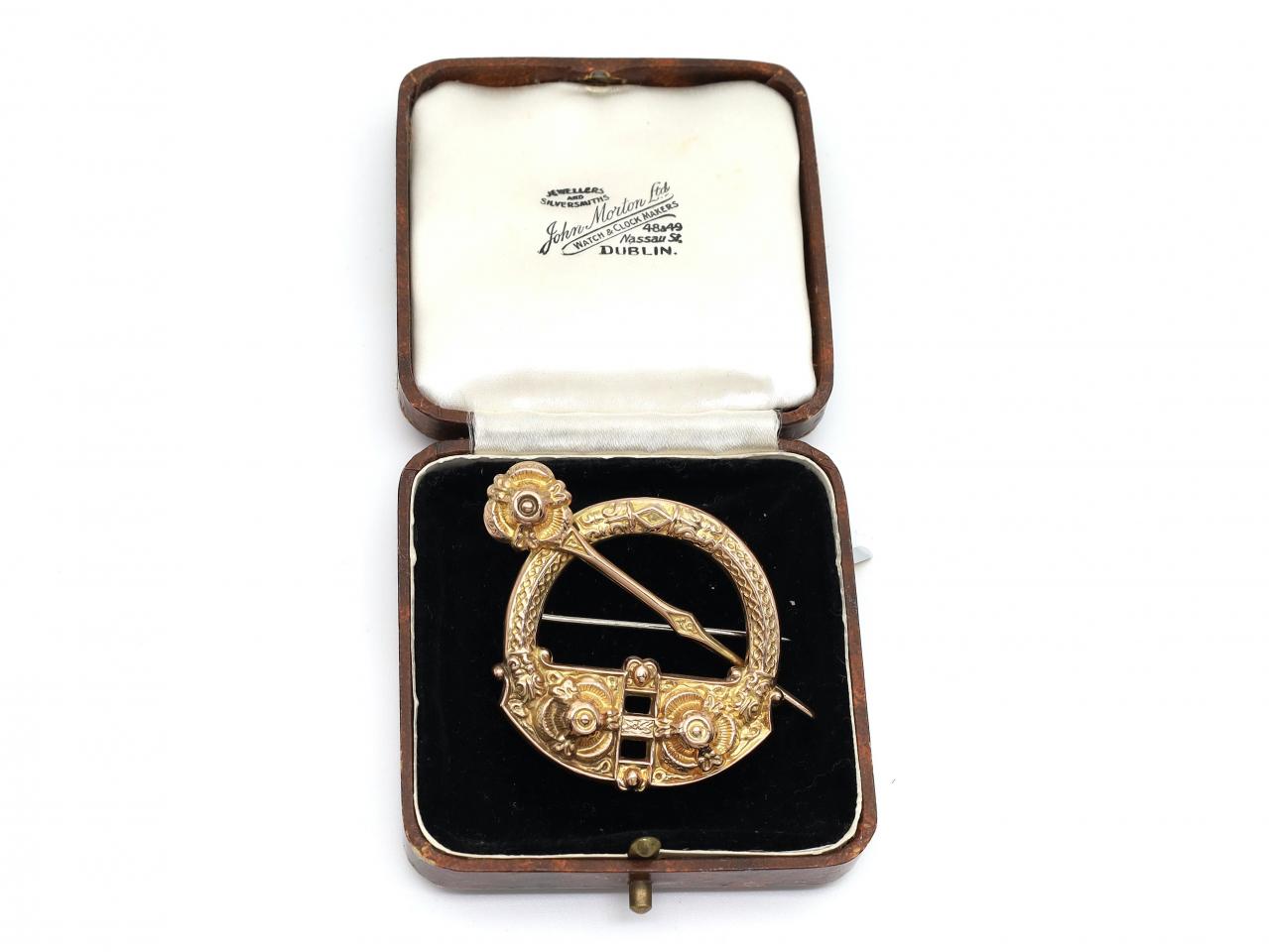 Vintage Tara brooch in 9kt yellow gold. A hollow brooch in the form of the Tara motif with intricate Celtic designs to front, fitted to the reverse with a secure hinged pin and C-Scroll. Hallmarked 9kt gold, Dublin.