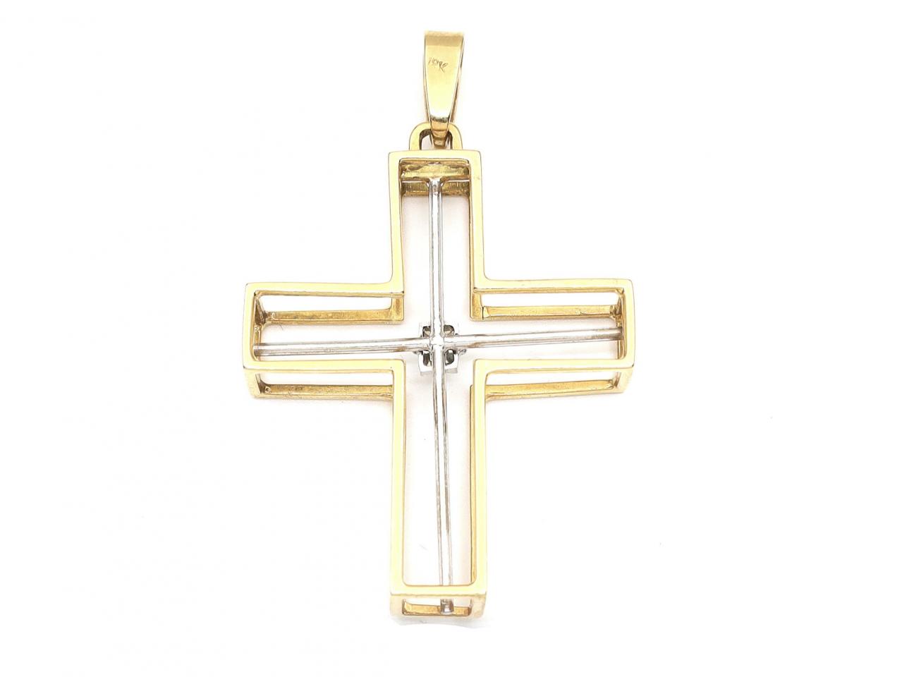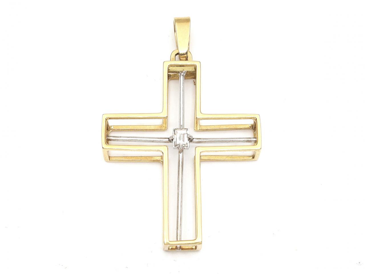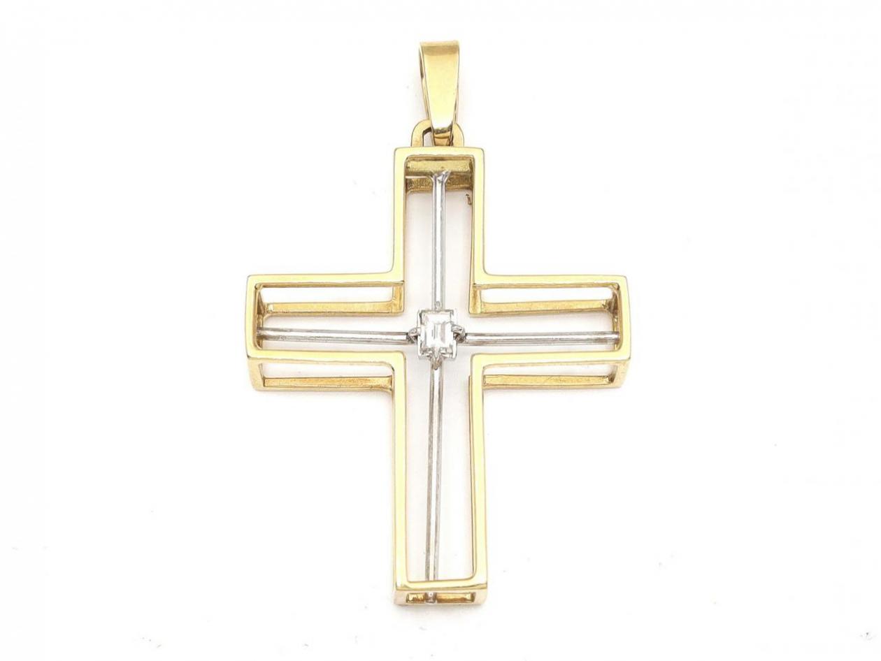 Vintage three dimensional diamond cross pendant in 18kt yellow gold. Centred with a rectangular step cut diamond in a claw setting, surrounded by open wirework in 18kt white and yellow gold, all suspended from a solid tapering bale. Marked 18kt gold.