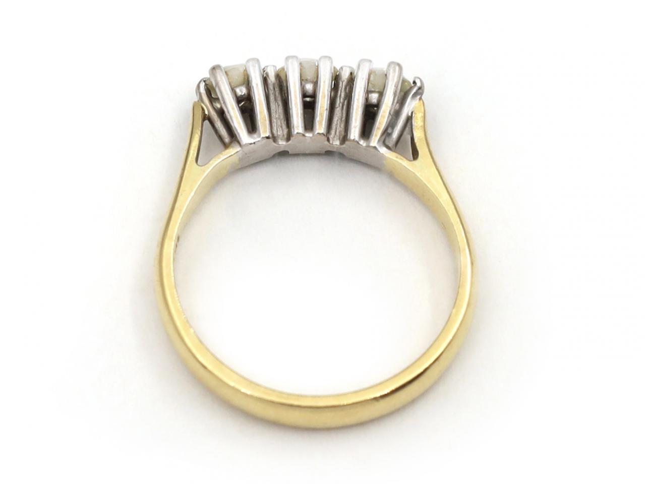 Vintage three stone diamond ring in 18kt yellow gold. Set across the finger with three round brilliant cut diamonds in raised claw settings, to a traditional three stone design with vertical collets fitted with structured linear claws, open gallery and met to either side with raised inwardly tapering shoulders which smooth to a soloid shank. Marked 18kt gold.