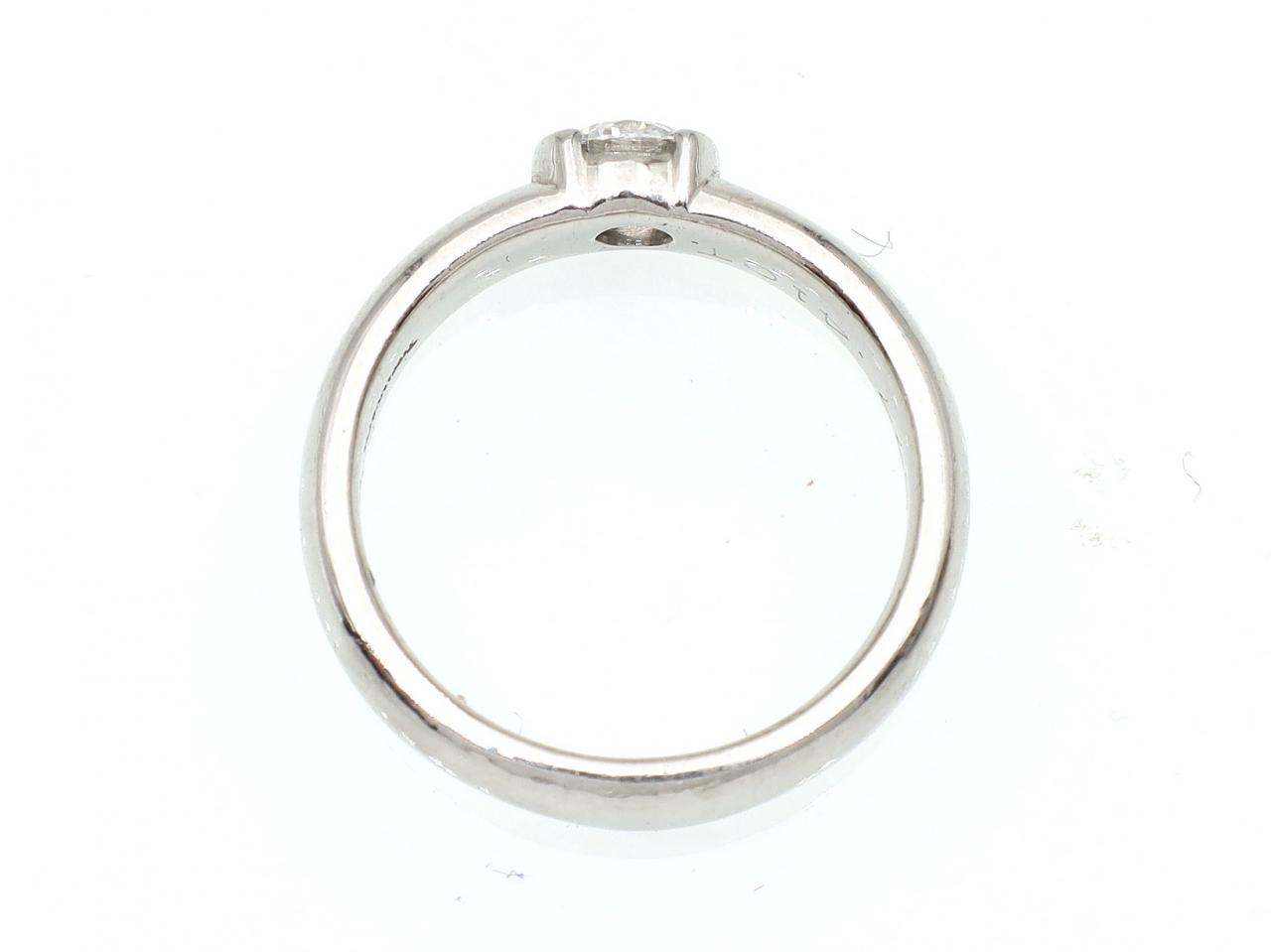 Vintage Tiffany & Co. 0.41ct diamond solitaire in platinum. Centred with a 0.41ct round brilliant cut diamond, I colour, VVS clarity in a half rubover setting, to a broad shank which continues to the reverse. Hallmarked platinum, numbered 'NO13677', signed 'TIFFANY & CO.'.