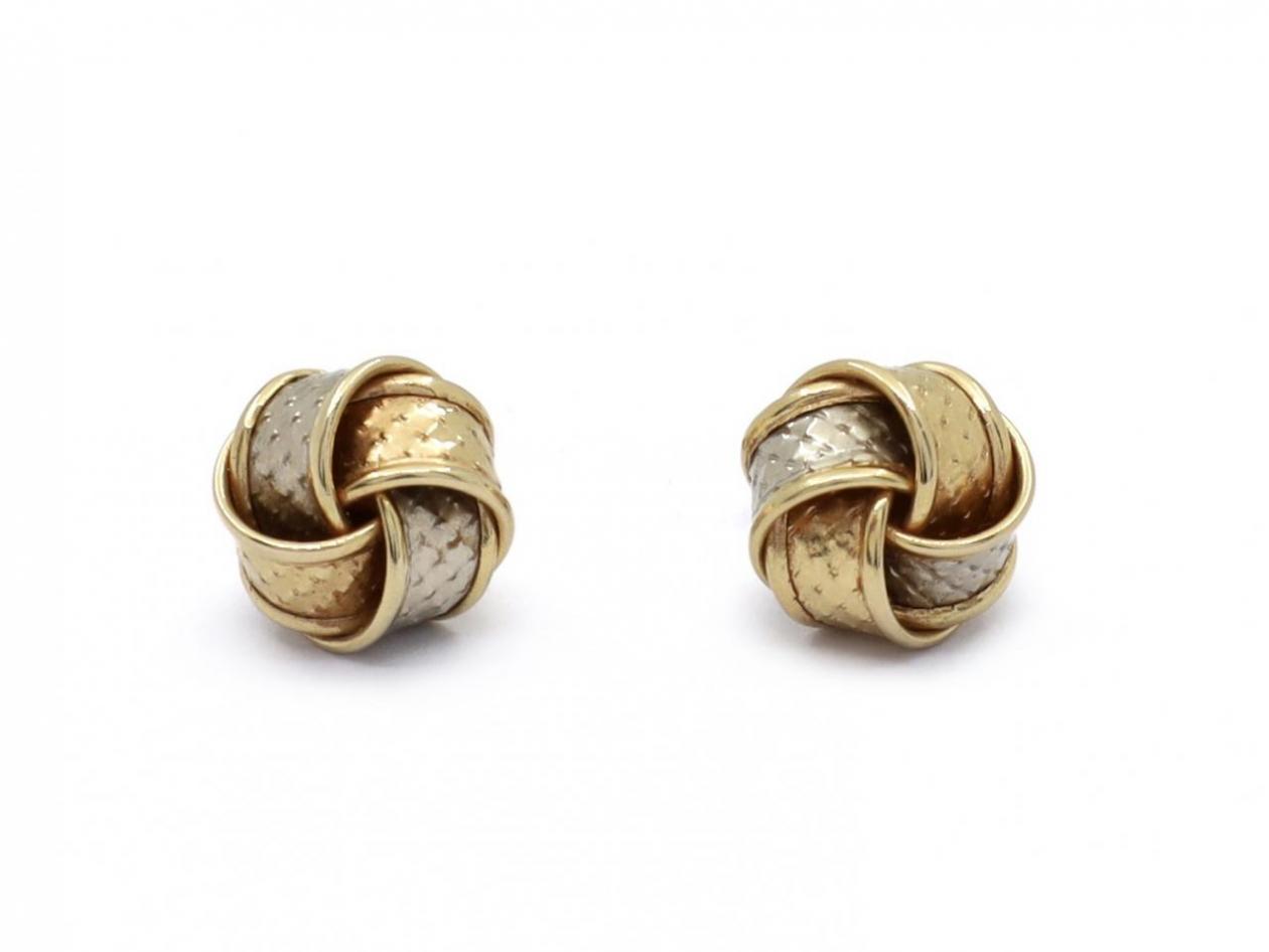 Vintage tri-gold knot stud earrings in 14kt and 18kt gold. A matching pair of earrings, each consisting of a three-dimensional knot motif with raised polished borders and faux woven ribbons, fitted to the reverse with a secure post and butterfly. Hallmarked 14kt and 18kt gold.