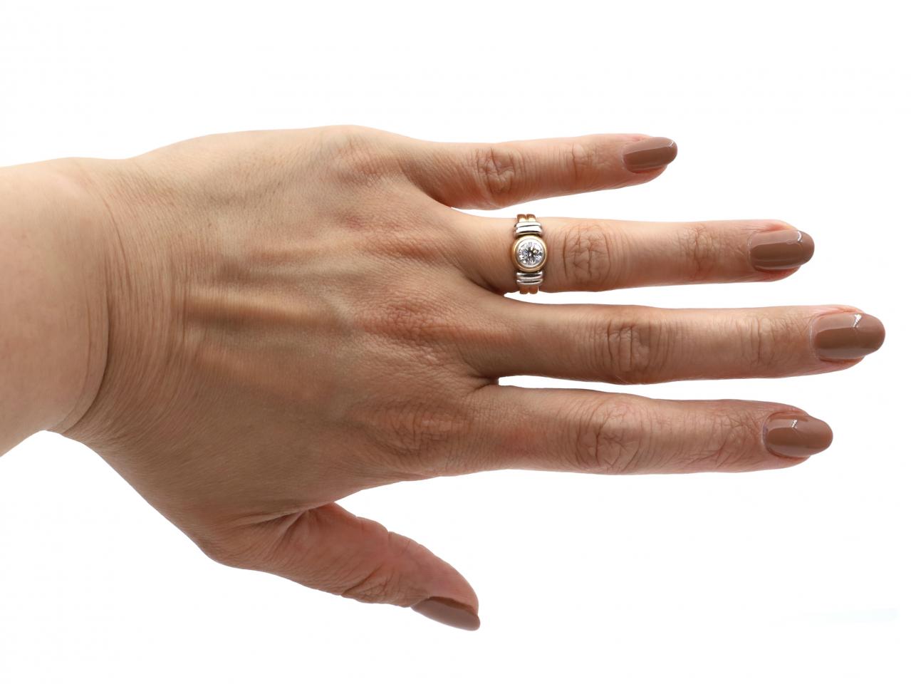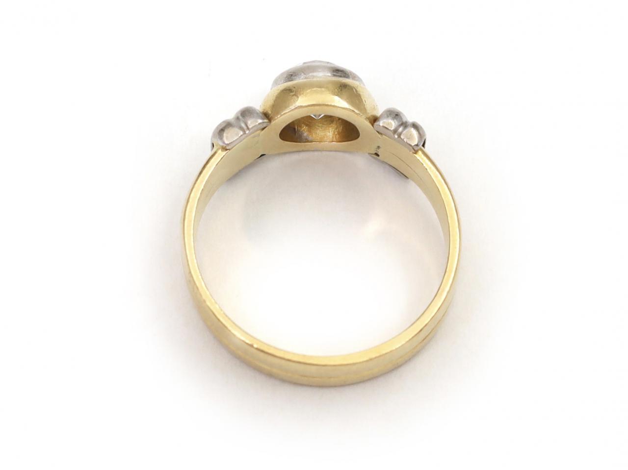 Vintage two tone bezel set diamond solitaire engagement ring in 18kt yellow and white gold. Centrally set with an estimated 0.60ct round brilliant cut diamond in a slightly raised rubover setting, to a solitaire design with polished setting, flanked to either side with white gold double ribbed terminals, set upon a double ribbed shank. Marked 18kt gold.