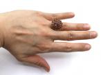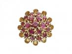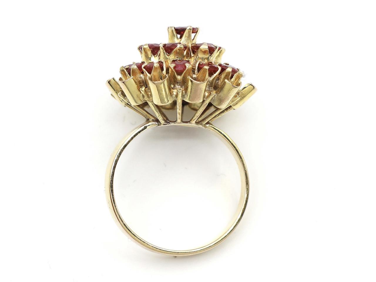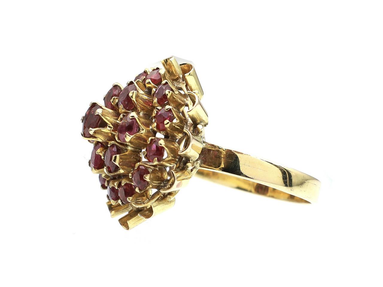 Vintage vertical ruby cluster ring in the form of a flower in 18kt yellow gold. Centrally set with a round mixed cut ruby in a raised claw setting, surrounded by two rows of round mixed cut rubies in claw settings, to a stepped raised cluster design with a scalloped frame and open gallery, flanked to either side with broad shoulders which curve to a solid shank. Marked 18kt gold.