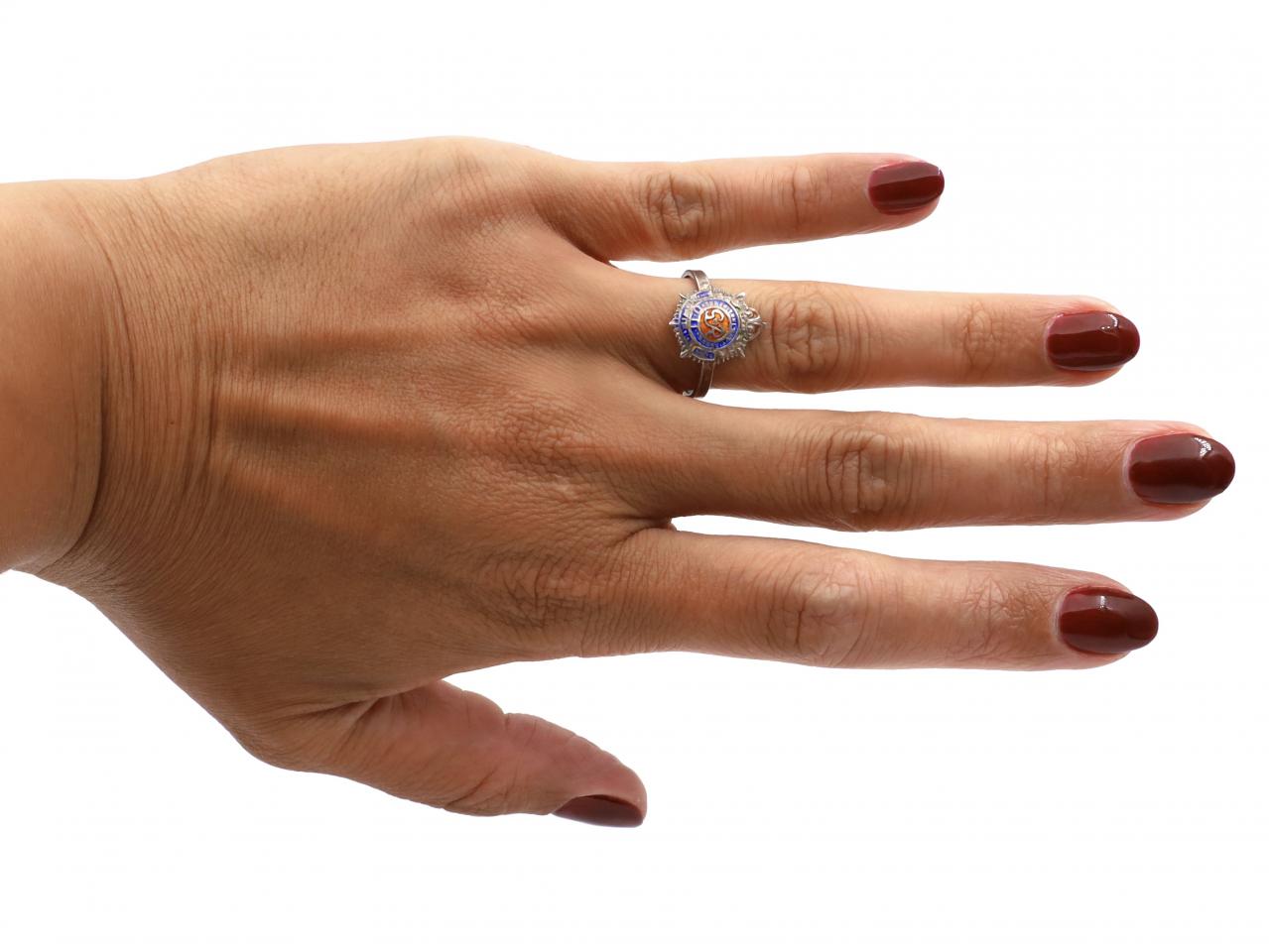 WWII Royal Engineers badge sweetheart ring in silver. A sterling silver ring fitted to the front with the official Royal Engineers badge which features King George's initials the garter and motto 'HONI SOIT QUI MAL Y PENSE' surmounted by a crown, highlighted with light red and royal blue enamel. Marked silver.